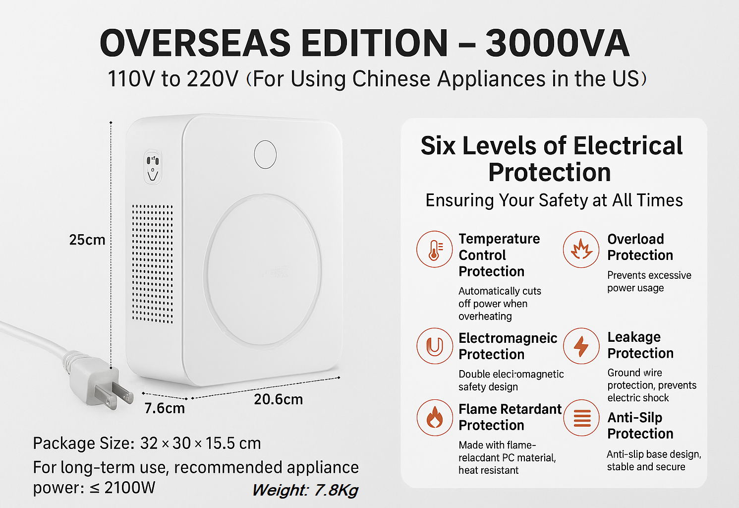 • 3000W Step Up Transformer 110v to 220v : This Step Up Transformer is suitable for using Europe Or Asian appliances in US; If you need to use 220V Asia devices appliances (especially Chinese products) such as Hair dryer, rice cooker, massage instrument, home beauty instrument, wall breaking machine, multi -functional dish machine in US, Canada, Mexico, please choose this 3000W Step Up Transformer 110v to 220v.
