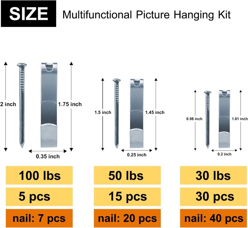 FUZANWJ Premium Picture Hanging Kits include 30 lbs (30 pcs), 50 lbs (15 pcs) and 100 lbs (5 pcs) to suit you from small pictures to heavier paintings for your wall picture hanging projects. This multi-purpose tool has a transparent storage box with dividers for convenient storage of all 50 pieces of hanging hardware.