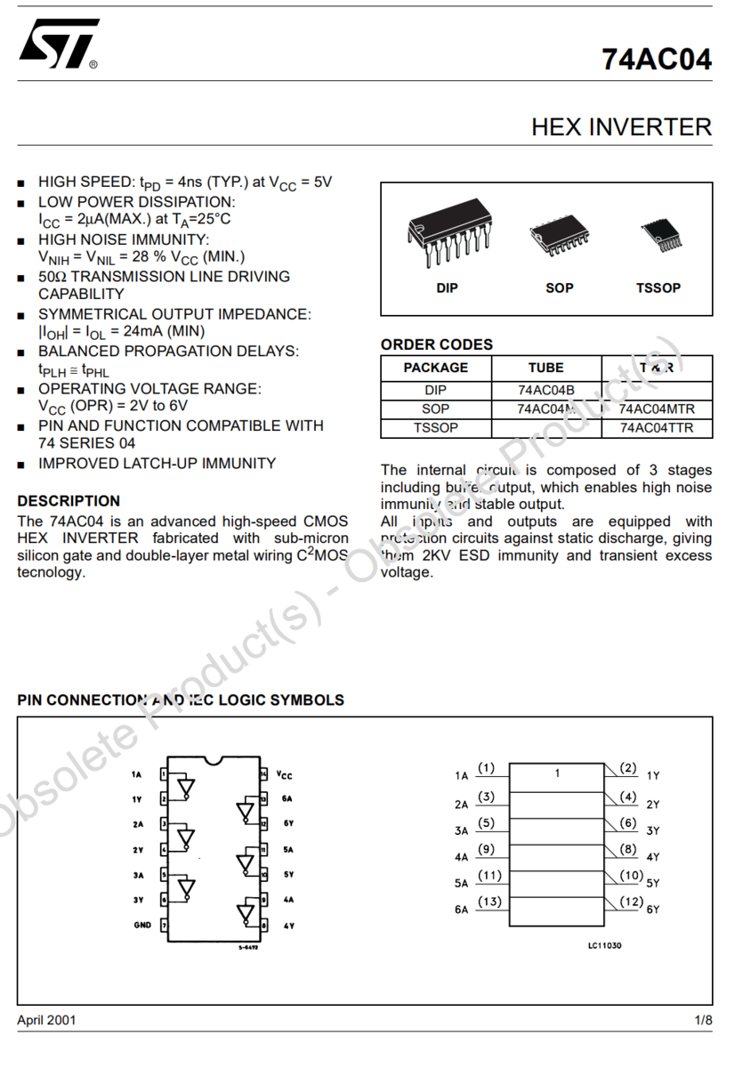 - 11PCS 74AC04M STMicroelectronics High Speed CMOS Hex Inverter 2V to 6V SOIC-14