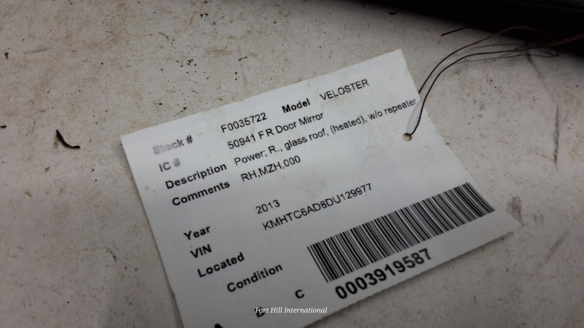 2012 through 2014 Hyundai Veloster right passenger side black heated door mirror for vehicles with glass roof, without signals.