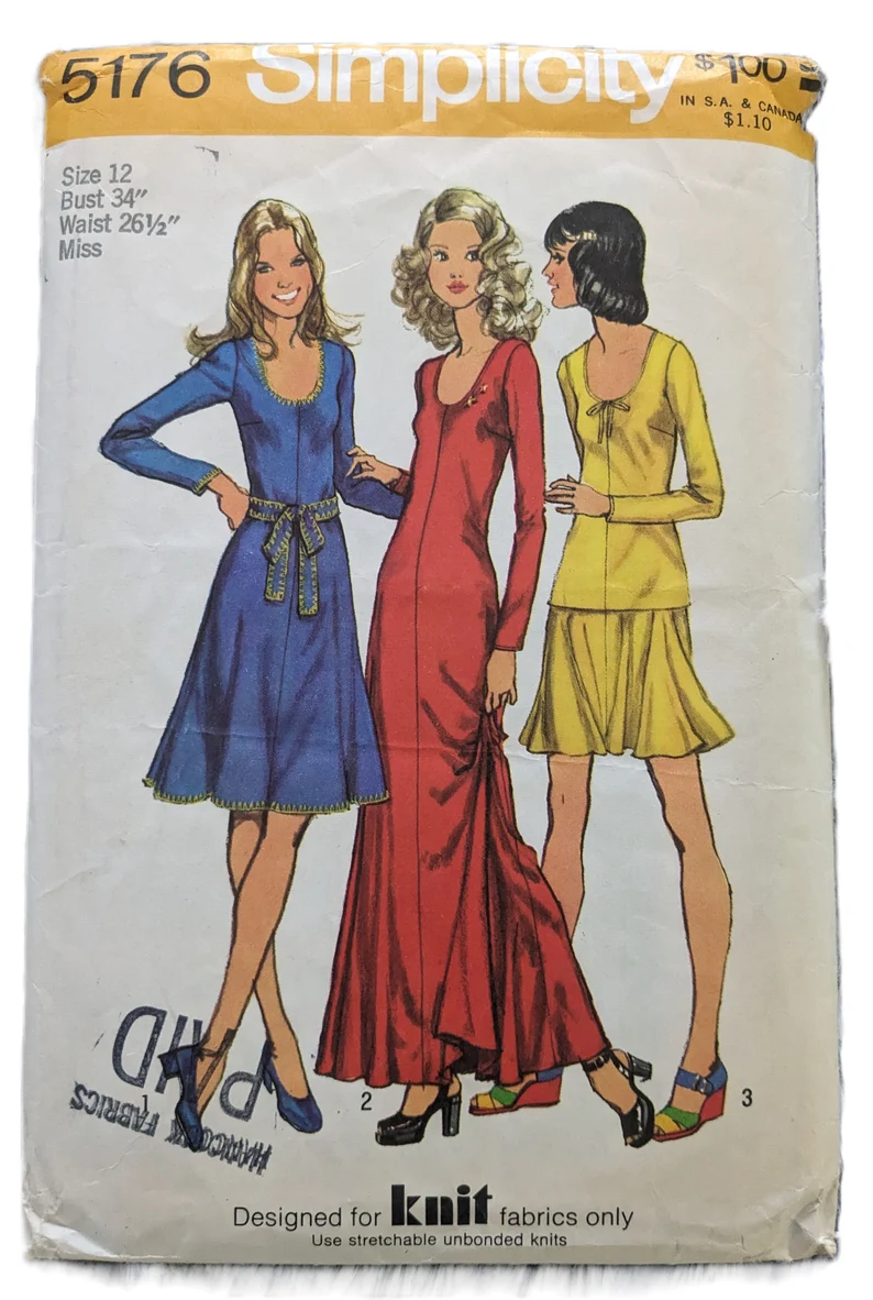 Cut/complete with all pieces. *Like all vintage sewing patterns, these patterns may have minor envelope damage, writing on envelope, and/or discoloration. Simplicity 5176; 1972; Misses' Dress in Two Lengths or Top and Mini-Skirt - (Designed for Knit Fabrics Only): The top and the flared dress with back zipper have low round neckline and long set-in sleeves. Regular length dress V. 1 with self fabric tie belt is detailed with embroidery. Ankle length dress V. 2 has top-stitching. Top V. 3 has self fabric bow and top-stitching. The flared mini-skirt V. 3 has elastic waistline casing