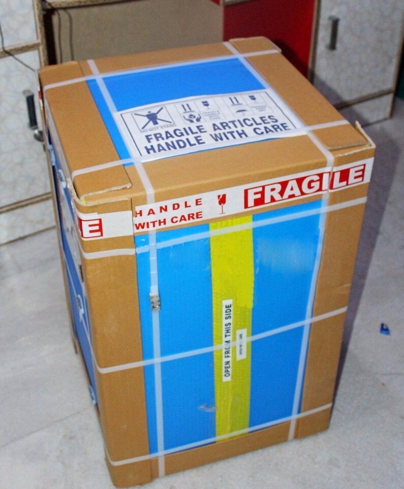Exportverpackung versiegeltes Holz, Kiste mit Schaumstoffbandern außen.