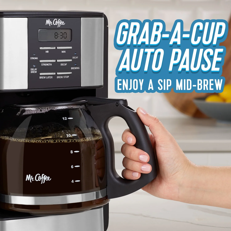 Mr. Coffee 12 Cup Programmable Coffee Maker with 3-Way to Brew System Brew Selector: This 12-cup coffee maker gives you 3 Ways to Brew! Choose between Regular, Strong Brew, or Decaf coffee at the touch of a button Delay Brew: This programmable coffee maker also has a Delay Brew feature that lets you set the coffee maker ahead of time, and wake up to fresh coffee Auto-Pause: Grab-a-Cup Auto Pause stops the brewing cycle if you want to grab a cup before brewing is finished Auto-Shutoff: 4-Hour Auto-Shutoff automatically turns off the coffee maker, so you don?t have to Lift Clean Filter Basket: The filter basket lifts out for fast, easy clean up Water Window: Easy-view Water Window lets you see the water level to prevent overflow