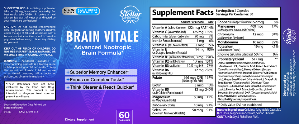 - 12 Pack Brain Vitale, advanced nootropic brain formula-60 Capsules x12