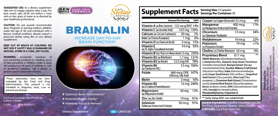 - 12 Pack Brainalin, promotes mental clarity & cognitive functions-60 Capsules x12