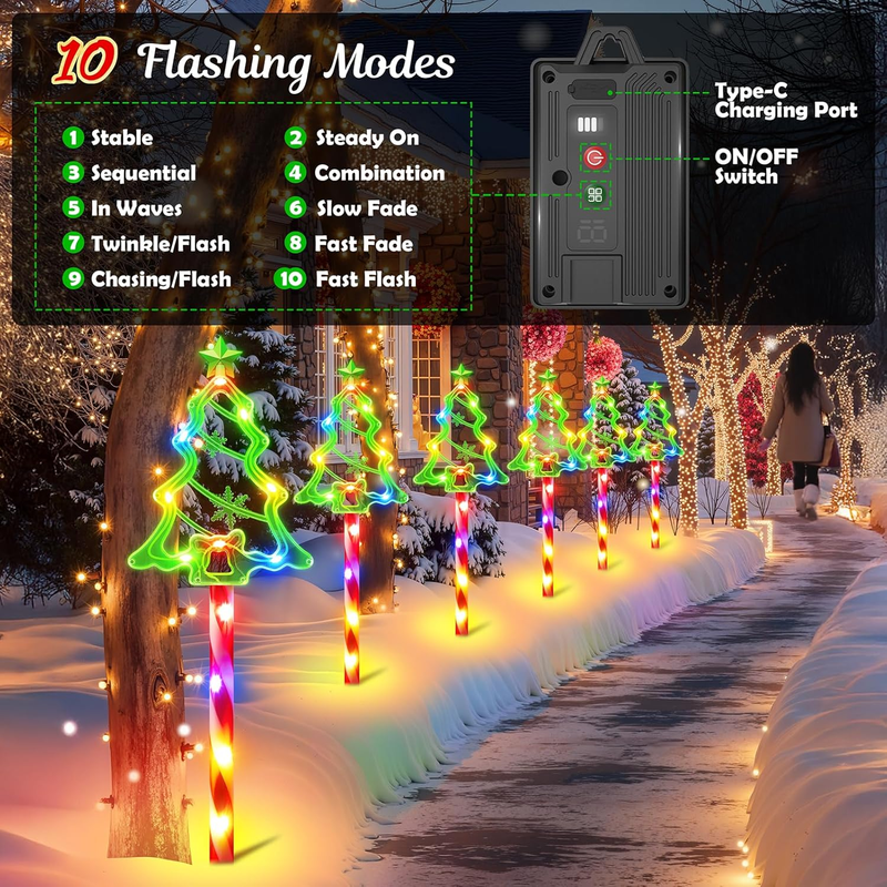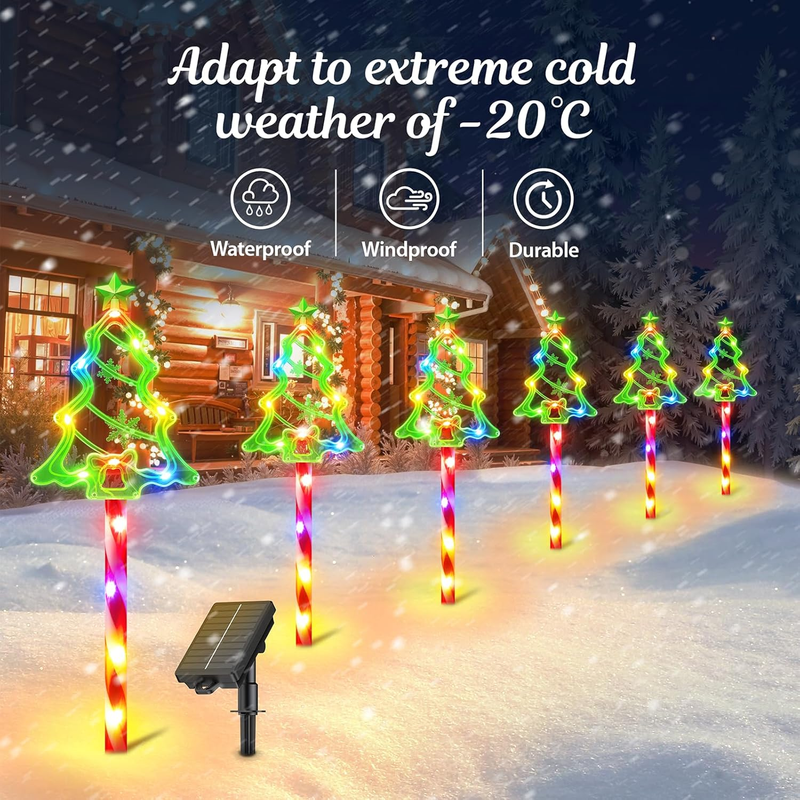 Auto ON/OFF Outside Christmas Decorations: Light up the way to your Christmas party with these solar powered christmas lights. Featuring upgraded solar panels and large-capacity batteries, these Christmas solar outdoor lights can illuminate continuously for 10-12 hours from dusk to dawn after charging for 6-8 hours. Fully powered by solar energy, they help you save on holiday electricity bills. The 270 adjustable solar panels ensure your Christmas pathway lights receive plenty of sunlight