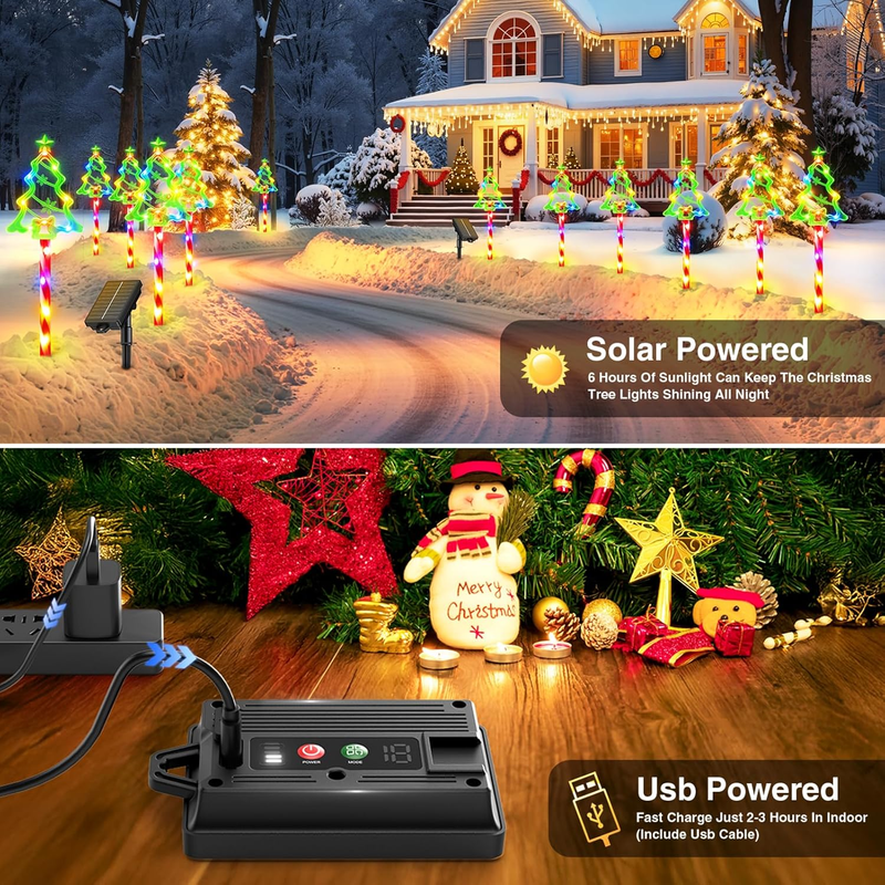 Two charging methods Upgrade length: Our solar christmas lights outdoor feature a dual charging mode(Solar charging usb charging), These Christmas lights have a total length of 29.5 feet, and the 2 set 12 pack combination can be separated and placed in different areas, which can perfectly cover the garden, courtyard, patio, lawn, snow, path, porch, sidewalk, Christmas tree, bringing gorgeous lighting and festive atmosphere to create a stunning Christmas display.