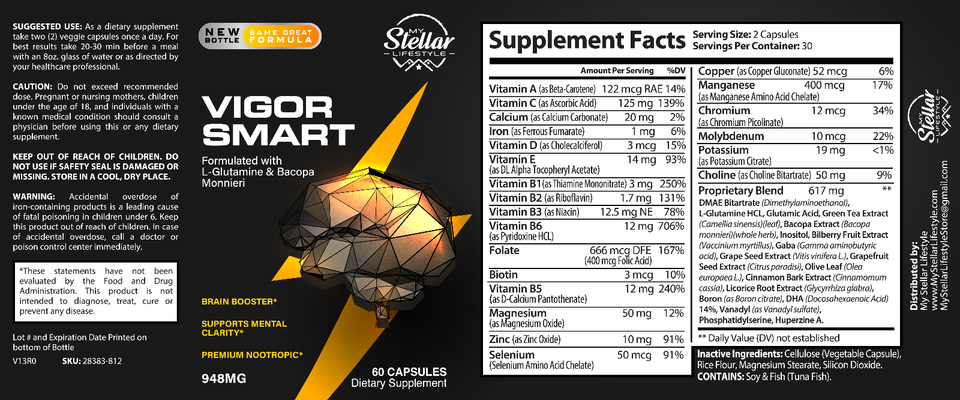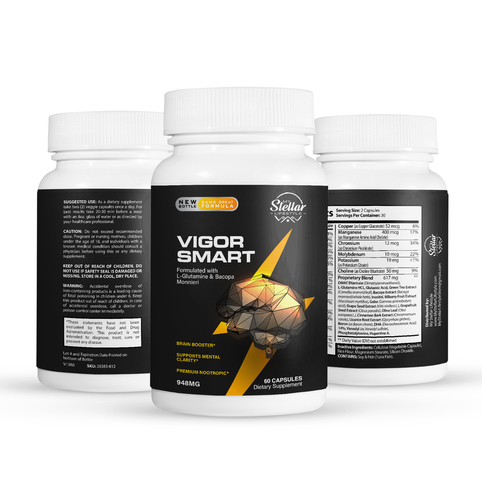Mezcla rica en vitaminas: Vigor Smart contiene una mezcla nutritiva de vitaminas, minerales y hierbas como bacopa, gaba, extracto de te verde, bitartrato de DMAE y glutamina. Diseñado para apoyar la funcion cerebral y la salud ideales.