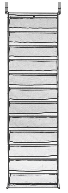 Mainstays 12-Tier over the Door Shoe Rack for 36 Pairs, Metal, Gray This over-the-door shoe rack is made of an epoxy-coated gunmetal frame Mesh-lined back prevents shoes from falling out while also protecting the door from scuffs Unique metal mesh design combination optimizes durability functionality Assembled Dimensions: 7.5 L x 21.625 W x 69.0 H inches Easy assembly with the tools included Stores up to 36 pairs of shoes Made to last, with strong yet breathable fabric and reinforced seams Style# MS89-565-009-05