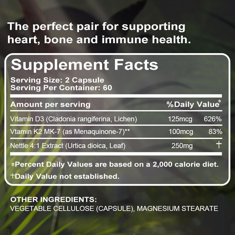 AN ESSENTIAL PAIRING - A growing body of evidence is showing that Vitamin K2 is as important as Vitamin D3 for the body to process calcium properly. Studies suggest potential benefits of Vitamin K2 for calcium metabolism, bone health, cardiovascular and brain function.