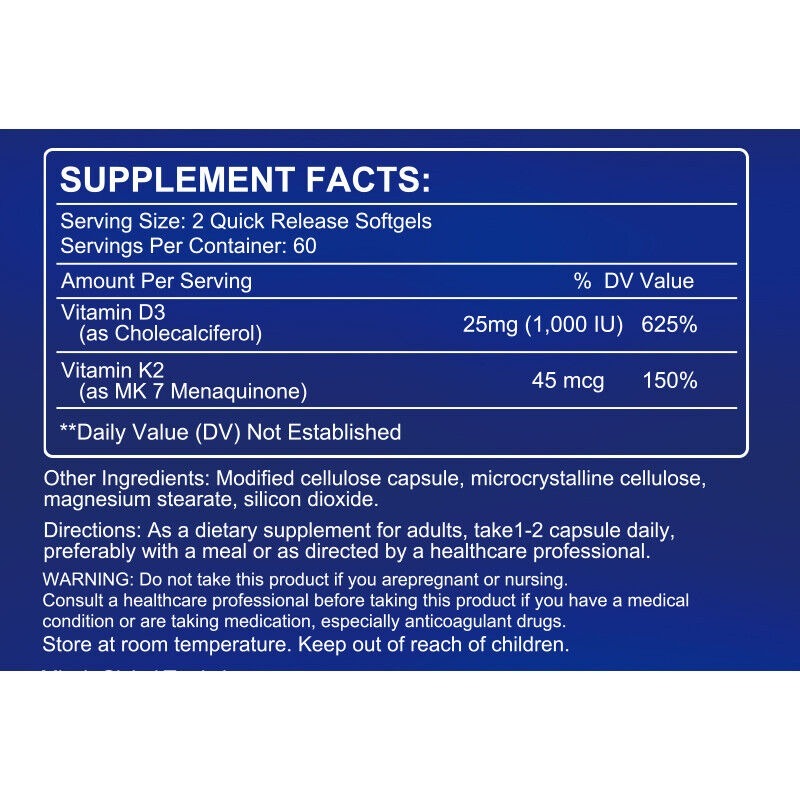 The Amazing Combination D3K2 - Most people know the benefits of Vitamin D, but many don’t know that Vitamin D assists Vitamin K2 to work at its capacity. Our k2 d3 vitamin supplement 1000 iu has a natural source and helps support strong bones.