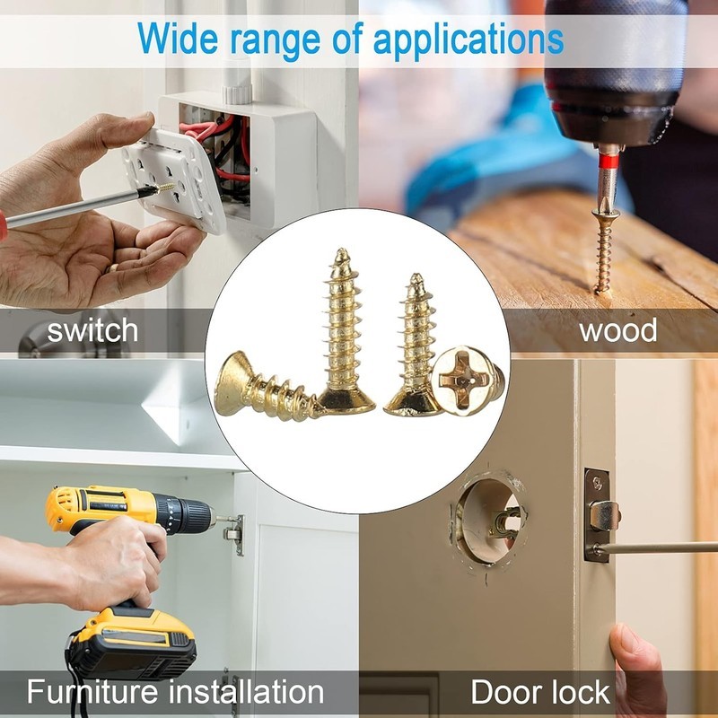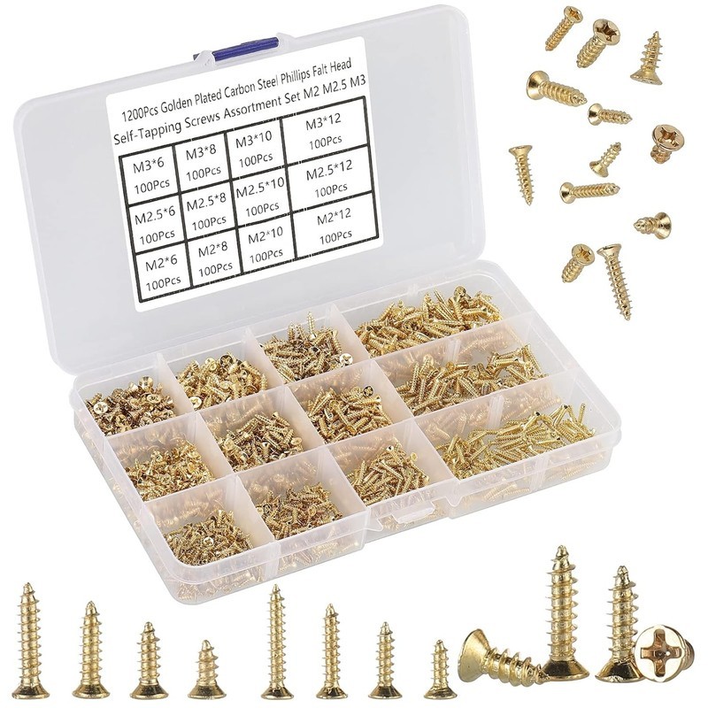 ??1200 Pcs 12 Types Screws?:Tiny Golden Color Phillips Flat Head Wood Screws Kits includes 12 sizes, them contains M2 x 6mm/8mm/10mm/12mm; M2.5 x 6mm/8mm/10mm/12mm; M3 x 6mm/8mm/10mm/12mm screws, meet all your demands, a must for your home life.for Wood,Plastic and Soft Metal.When screwing the screw,if you use s hand electric drill please adjust it to a low gear and the torque should be below12.excesive torque may damage the screw or the puncture the wood