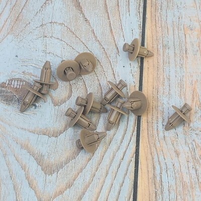 Exact item set is shown. New old stock with original packaging. Tan plastic clips, approximately 19mm long and 13mm outer diameter. Unknown country of manufacture. No returns on installed items or partial sets. Please review our business policies in our store for information regarding returns, shipping and warranties.