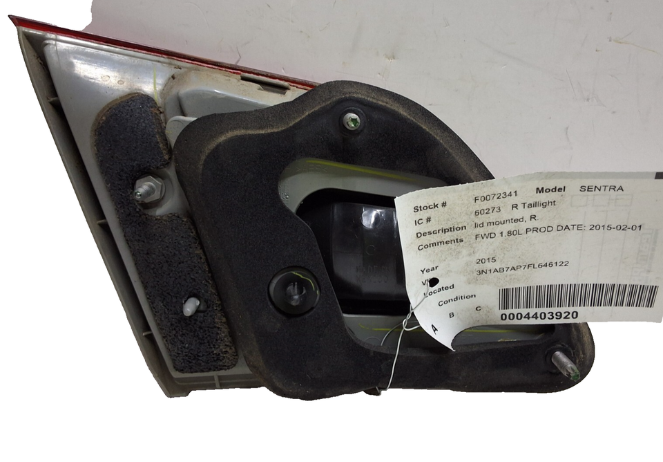 2013 through 2015 Nissan Sentra right passenger lid mounted inner tail light assembly.