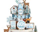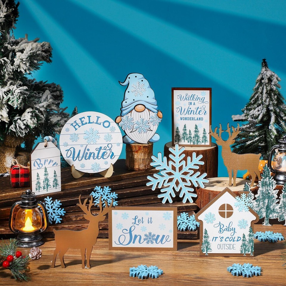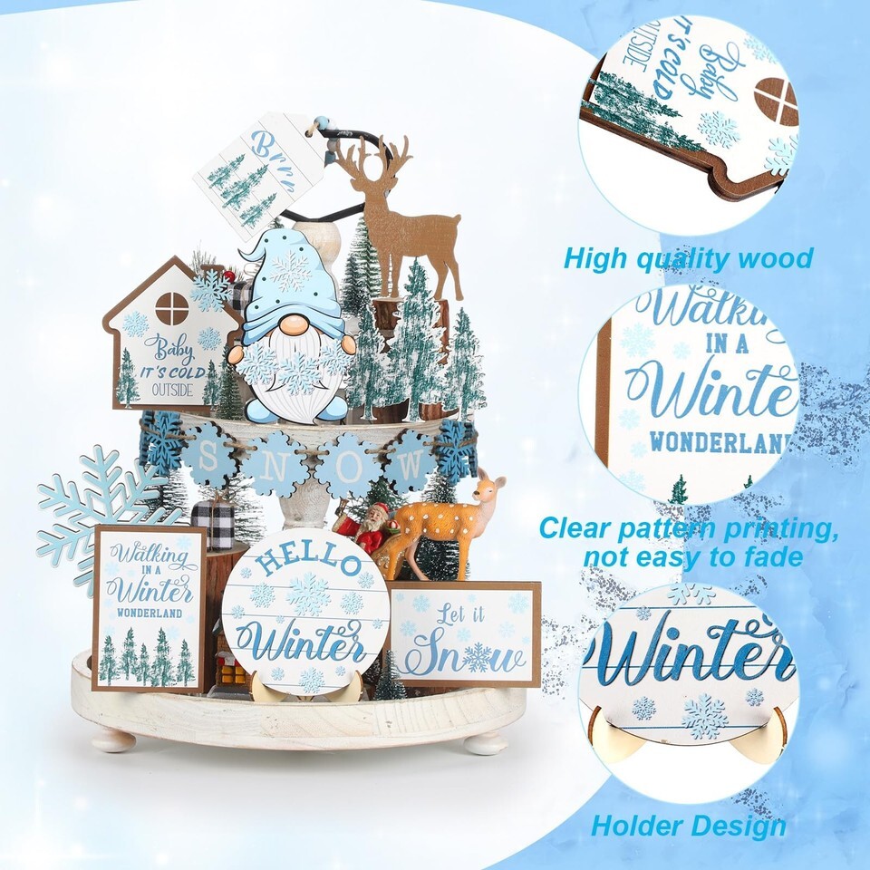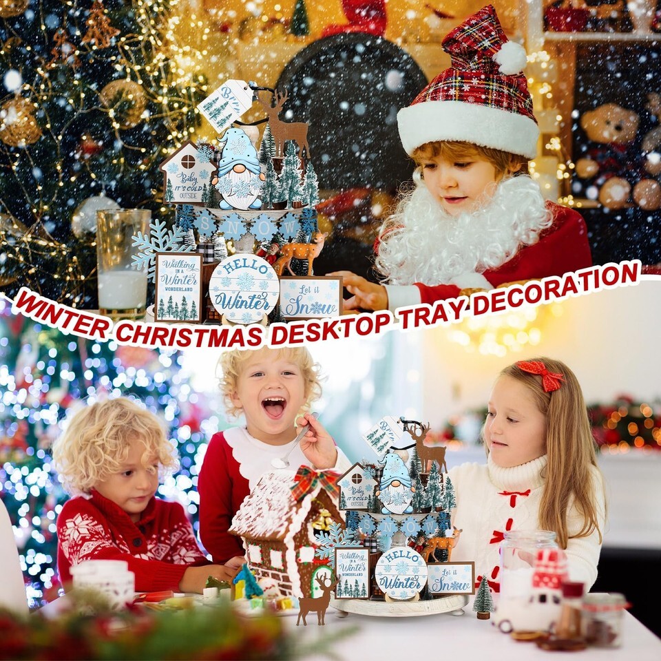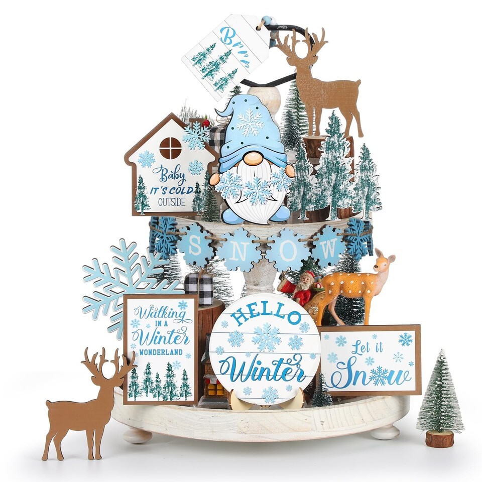 - 13 Pc Winter Tiered Tray Decor Elk Sled Tree Snowflake Wood Blocks