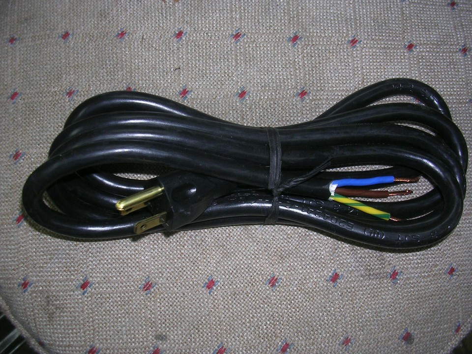 14-3 copper 6 foot power cable with standard 3 pin wall plug and open end for crimp or solder connections. Rated at 15 amps. International color coding on the wires. Several units available. Free shipping with 3 or more units.