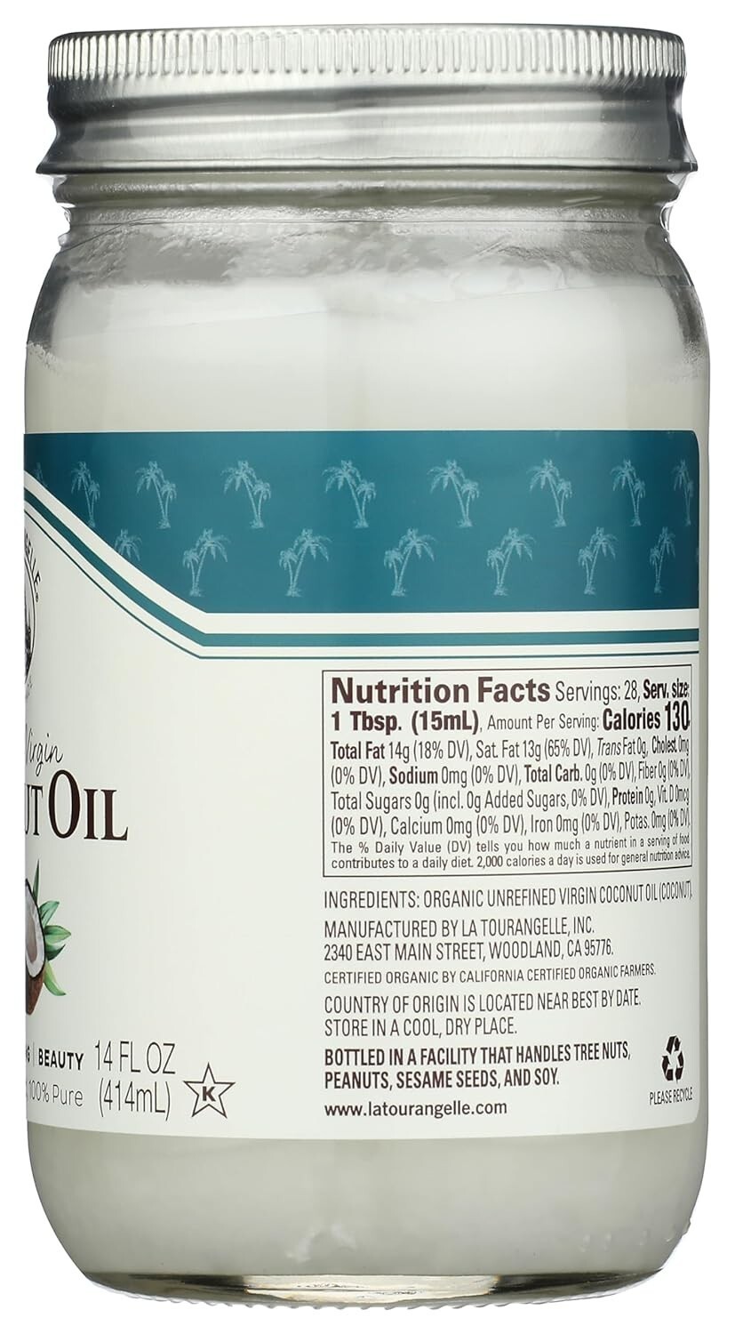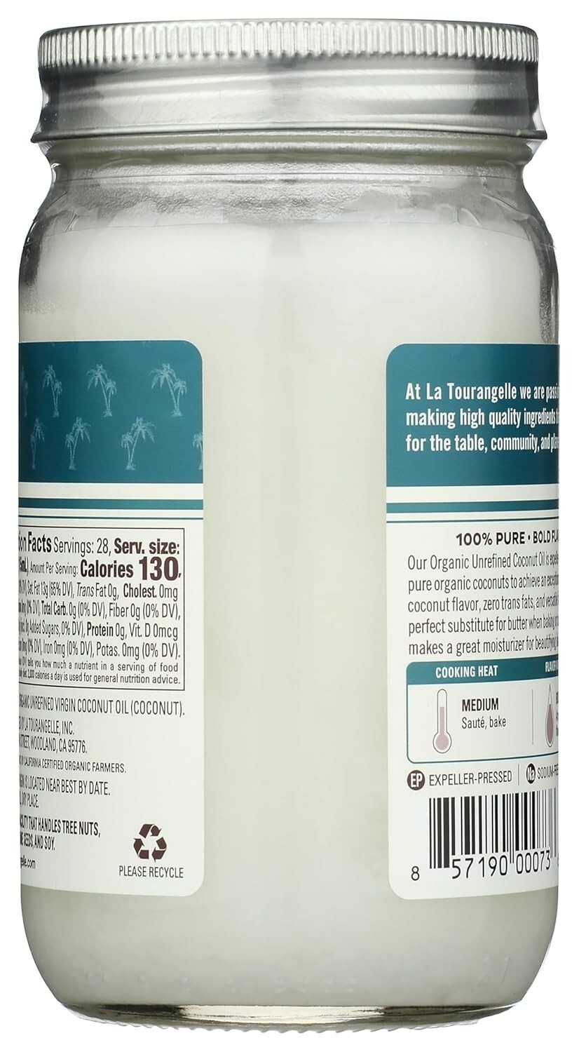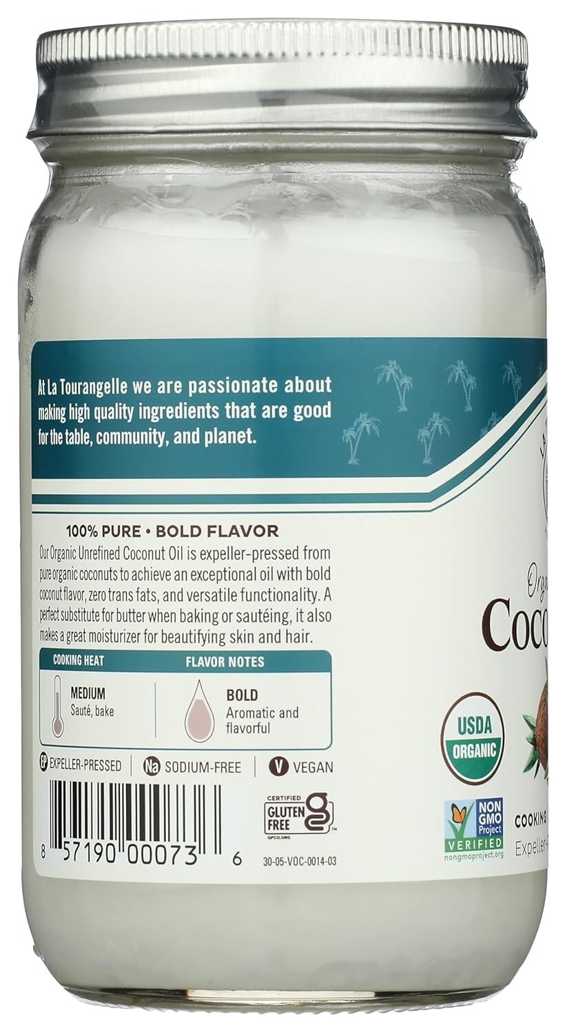Discover La Tourangelle's Organic Virgin Unrefined Coconut Oil, a versatile and natural essential for your kitchen and beauty routine. With a pure, fresh coconut taste, enticing aroma, and smooth texture, it's perfect for cooking, baking, dressings, frying, or moisturizing skin and hair. Crafted from high-quality ingredients, this oil offers authentic flavor and health benefits, including being a source of MCTs. Embrace a sustainable, non-GMO, Kosher-certified product that elevates your dishes and self-care rituals. Whether you're a professional chef or a home cook, enhance your culinary creations with the bold flavors of the tropics.