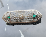14K WHITE GOLD DIAMOND AND TRILLION EMERALD FILIGREE ART DECO BROOCH 2.1 gram