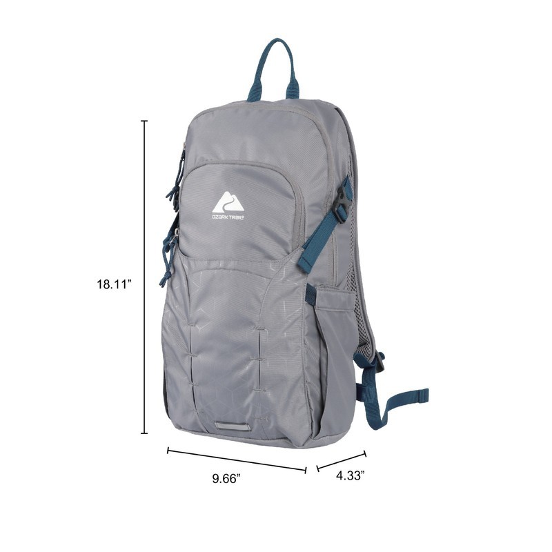 Ozark Trail 14L Hydration Pack Pack Capacity: 14 liters 2L water reservoir included Two main compartments allow for maximum storage and organization Airmesh padded shoulder straps and back panel for added comfort without a frame Low profile adjustable sternum strap for a comfortable fit Reflective accents for safety Shove pocket with clean, gusseted design for extra storage Side profile daisy chains Age Range: Teenager - Adult Product weight: 1.188 lbs Dimensions (inches): 8.66 W x 4.33 D x 18.11 H