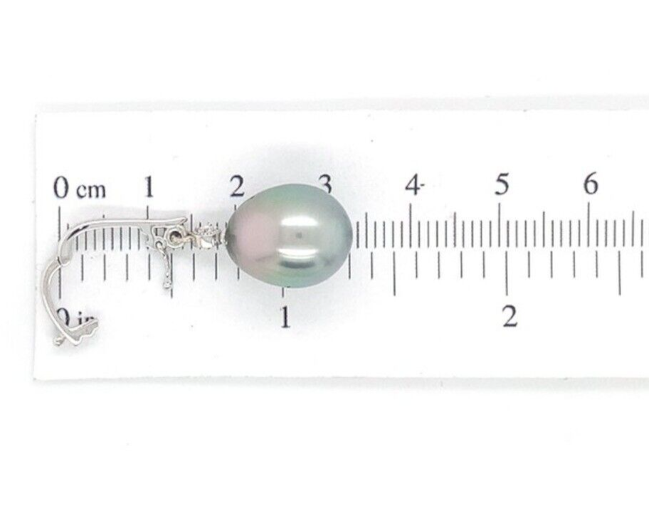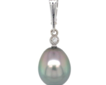 14k white gold enhancer pendant featuring a large 14.2mm black cultured Tahitian pearl. The pearl is a fine quality with peacock and aubergine overtones. It is a drop shape and is very clean without blemishes. There is a small round brilliant cut diamond accent weighing .03cts.