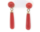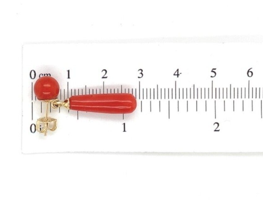 14k yellow gold genuine natural coral bead and briolette drop earrings post and clutch backs. The round coral beads measure about 7mm, and the briolette drops measure about 3/4" long. The coral are a fine ox blood red-orange.
