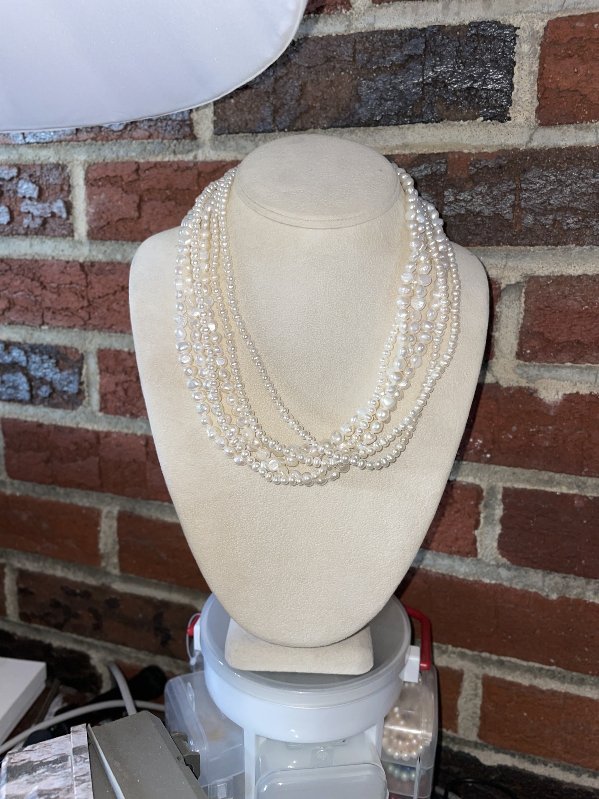 *Showcase the intriguing beauty of high luster Genuine Freshwater Pearls w/ this one-of-a-kind 6-strand of freshwater pearls necklace. Pearls ranging in size form .25mm round all the way up to 6.5+mm. Change your look, with just a twist