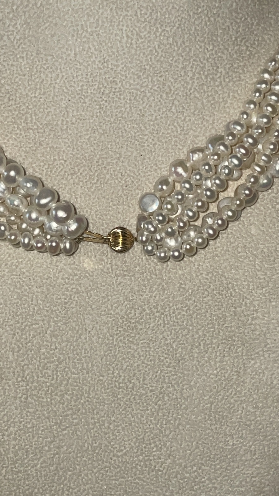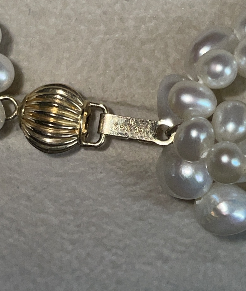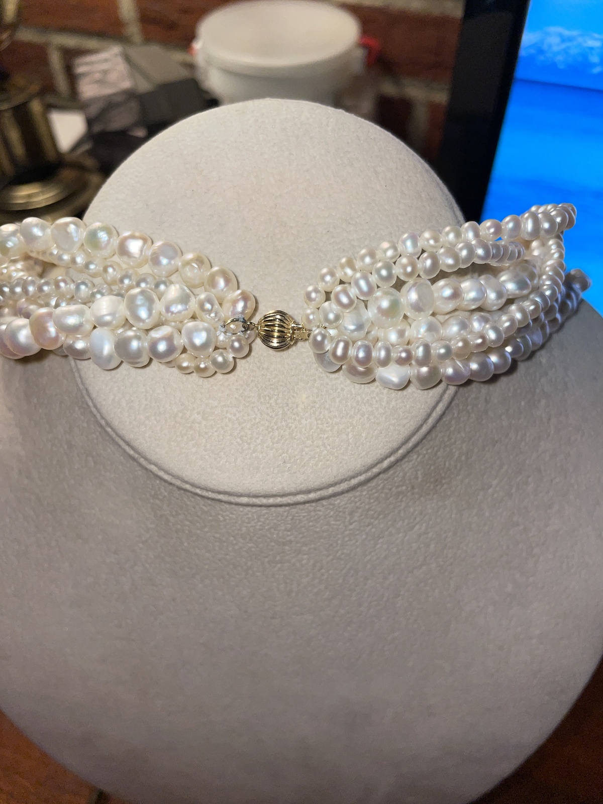 - 14k Multi Strand Genuine Freshwater Pearl Necklace 16-18" Vintage Showcase Piece