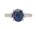14k white gold sapphire and diamond ring featuring an oval blue sapphire weighing 1.74 carats. The genuine earth mined blue sapphire has navy blue color and measures about 8mm x 6.2mm. The sapphire is accented by thirty small genuine earth mined round brilliant cut diamonds weighing about .21cts.