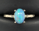 14k white gold ring with a genuine earth mined Australian black opal. The opal weighs 2.10 carats and is an elongated oval cabochon measuring about 9.3mm x 6.3mm. The miner stated that the stone was mined at Lightning Ridge. The opal has a dark navy blue to grey body color with primarily blue-green play of color.