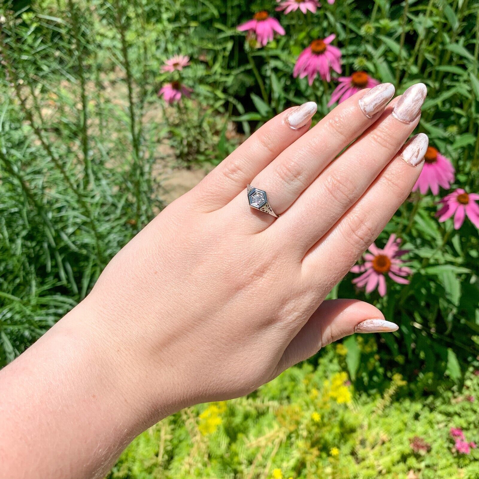 - 14k White Gold Art Deco Filigree Ring w/ .22ct Genuine Natural Diamond (#J6818)