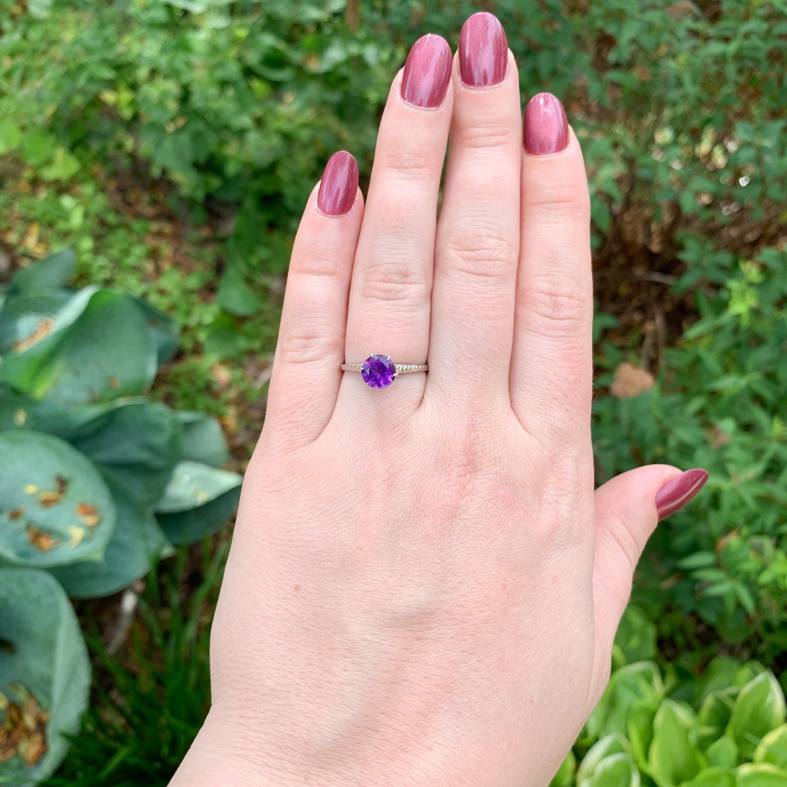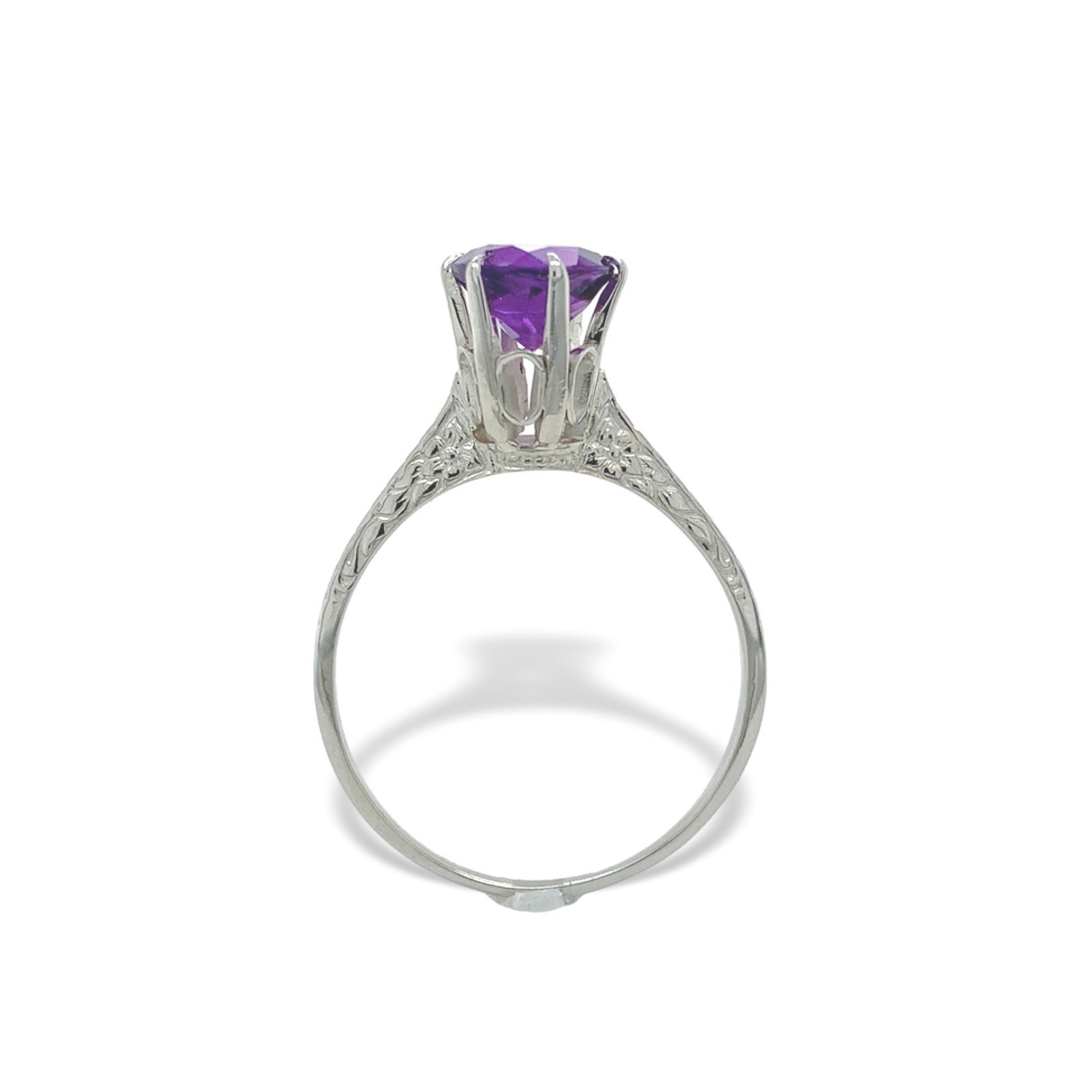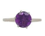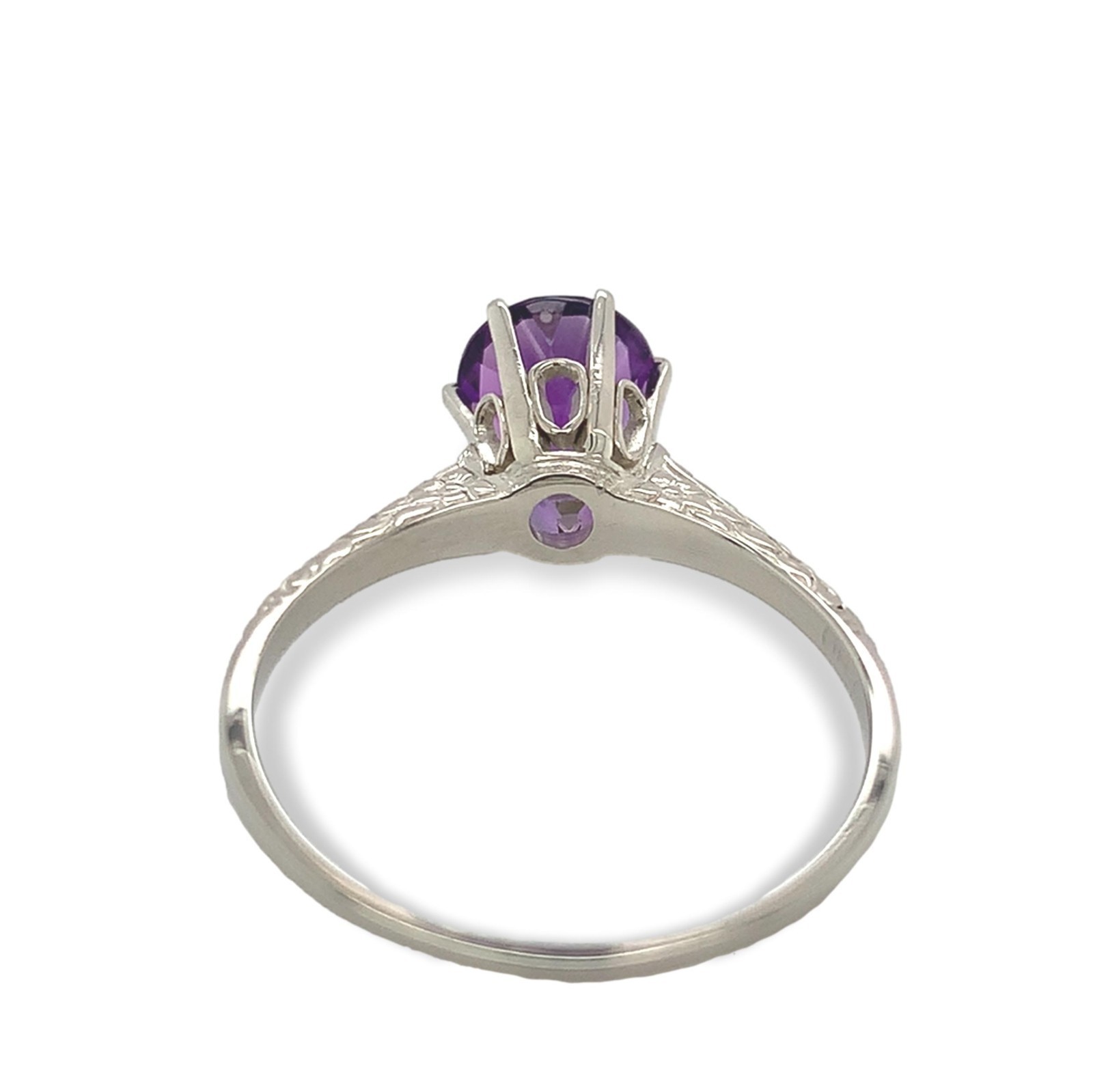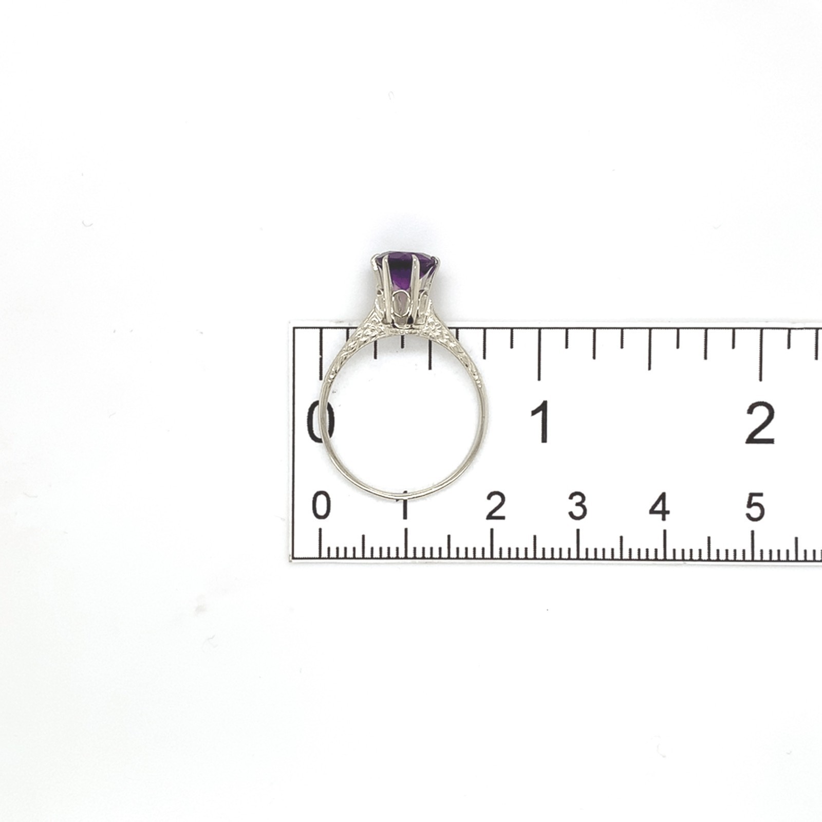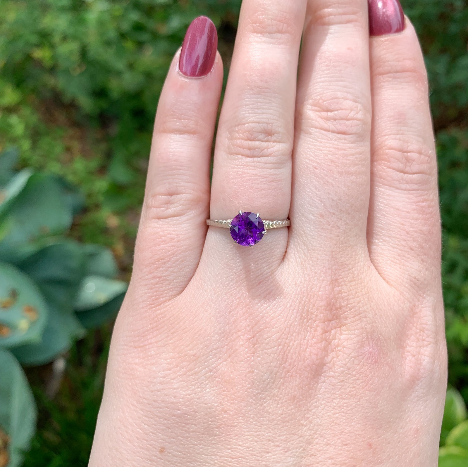 14k white gold Victorian amethyst ring. The genuine earth mined amethyst measures about 6.8mm and weighs 1.05 carats. The round brilliant cut amethyst is a fine purple color with fuchsia flash. The ring fits a size 7.5 finger and weighs 1.32 dwt. It dates from about 1900. Pretty!