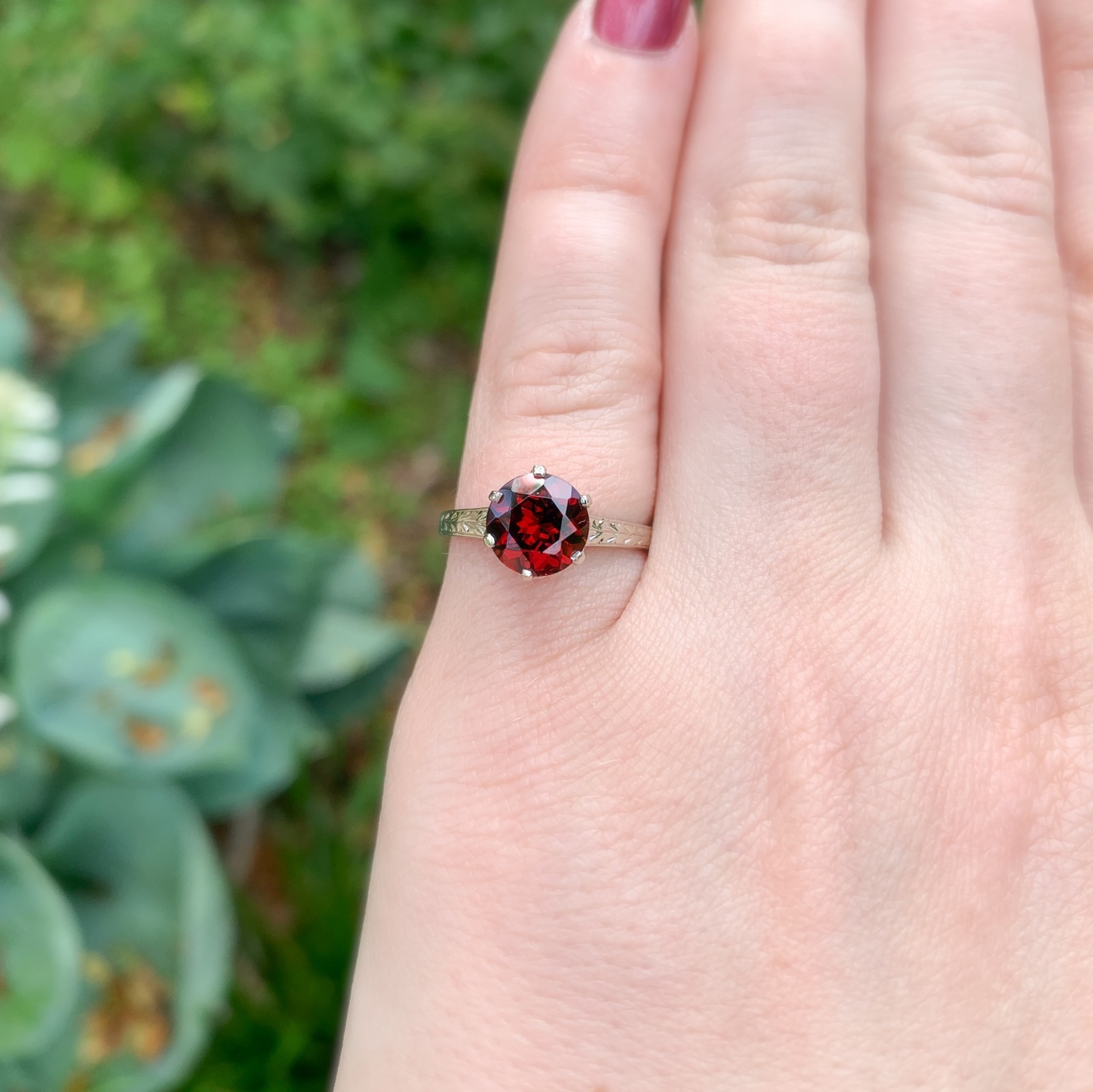 14k white gold Victorian garnet ring. The genuine earth mined garnet measures about 7.5mm and weighs 1.90 carats. The round brilliant cut garnet is a dark red color. The ring fits a size 5.5 finger and weighs 1.56 dwt. It dates from about 1900. Fabulous!
