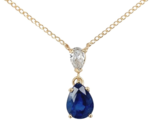 14k yellow gold pear shape blue sapphire and diamond necklace. The genuine earth mined blue sapphire is a pear shape measuring about 8.5mm x 6mm and weighing 1.84 carats. The sapphire is a navy blue color. The genuine earth mined pear shaped diamond measures about 5mm x 3.2mm and weighs about .15cts.