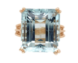 14k yellow gold ring with a large emerald cut aquamarine. The light sky blue genuine earth mined aqua measures about 13mm x 11.7mm x 8.6mm and weighs about 10 carats. The mounting has applied rope detail. The ring fits a size 6.0 finger and weighs 3.77 dwt. It is contemporary. Fabulous!
