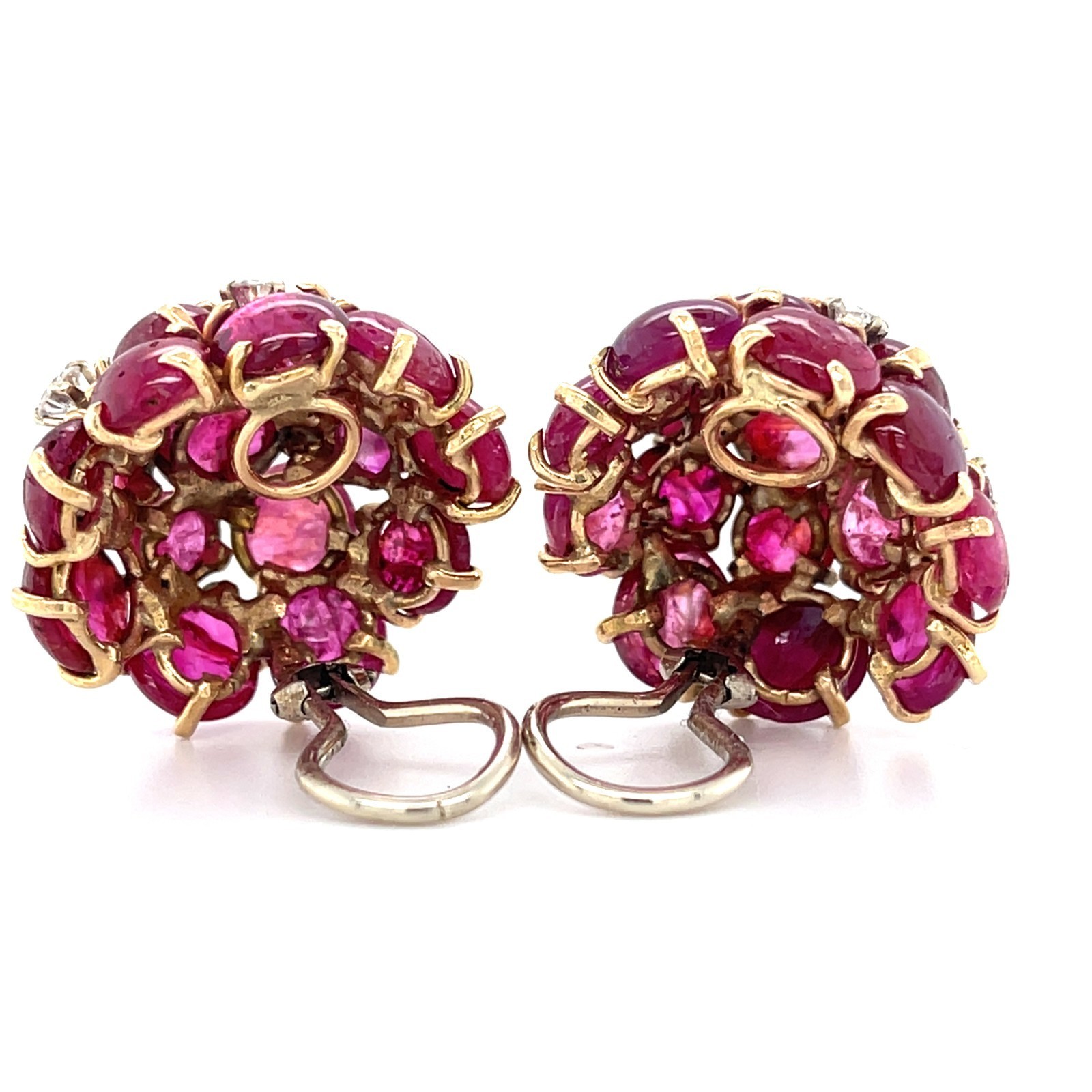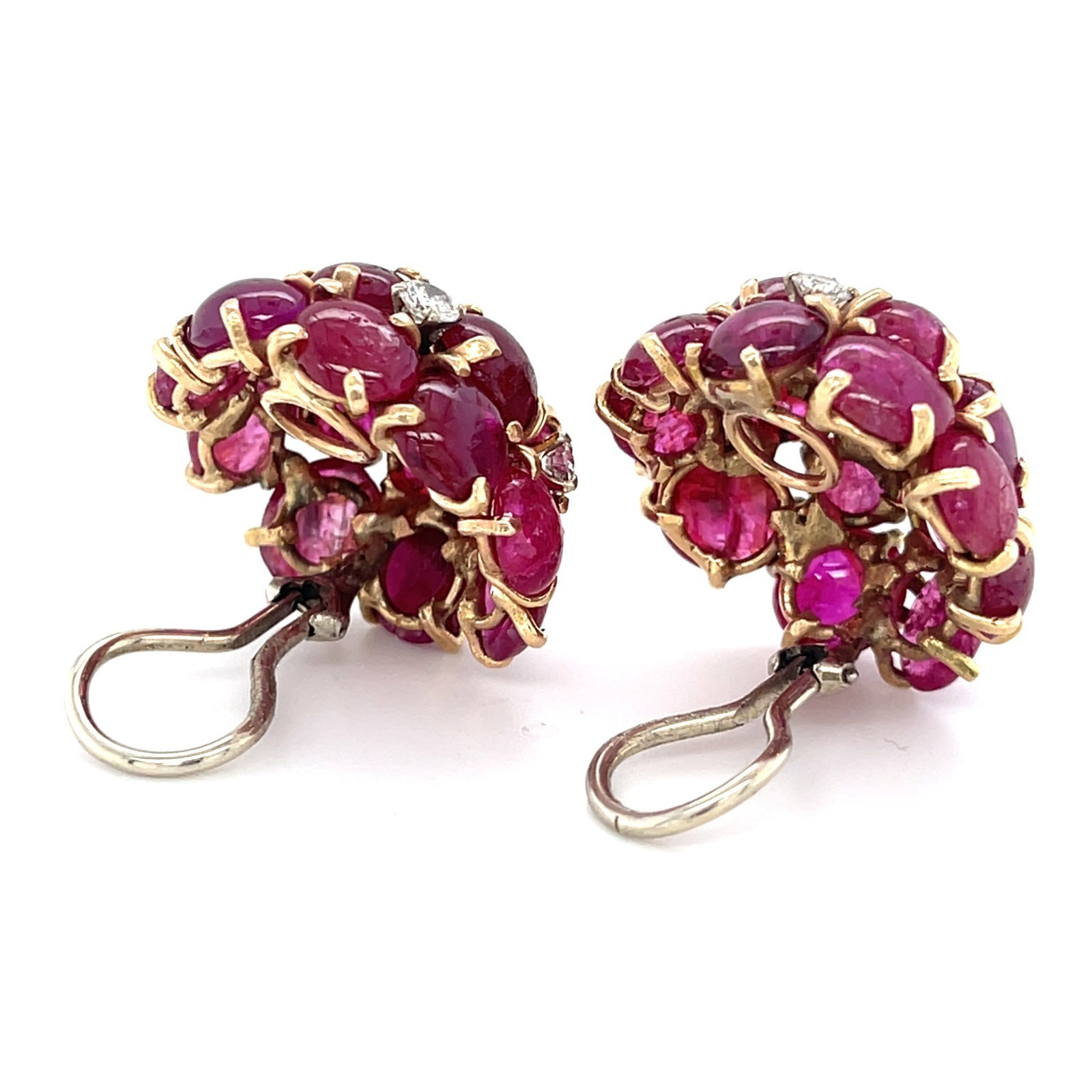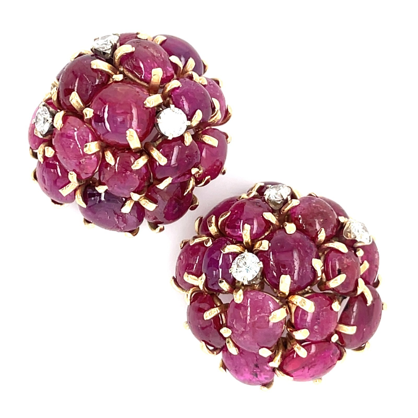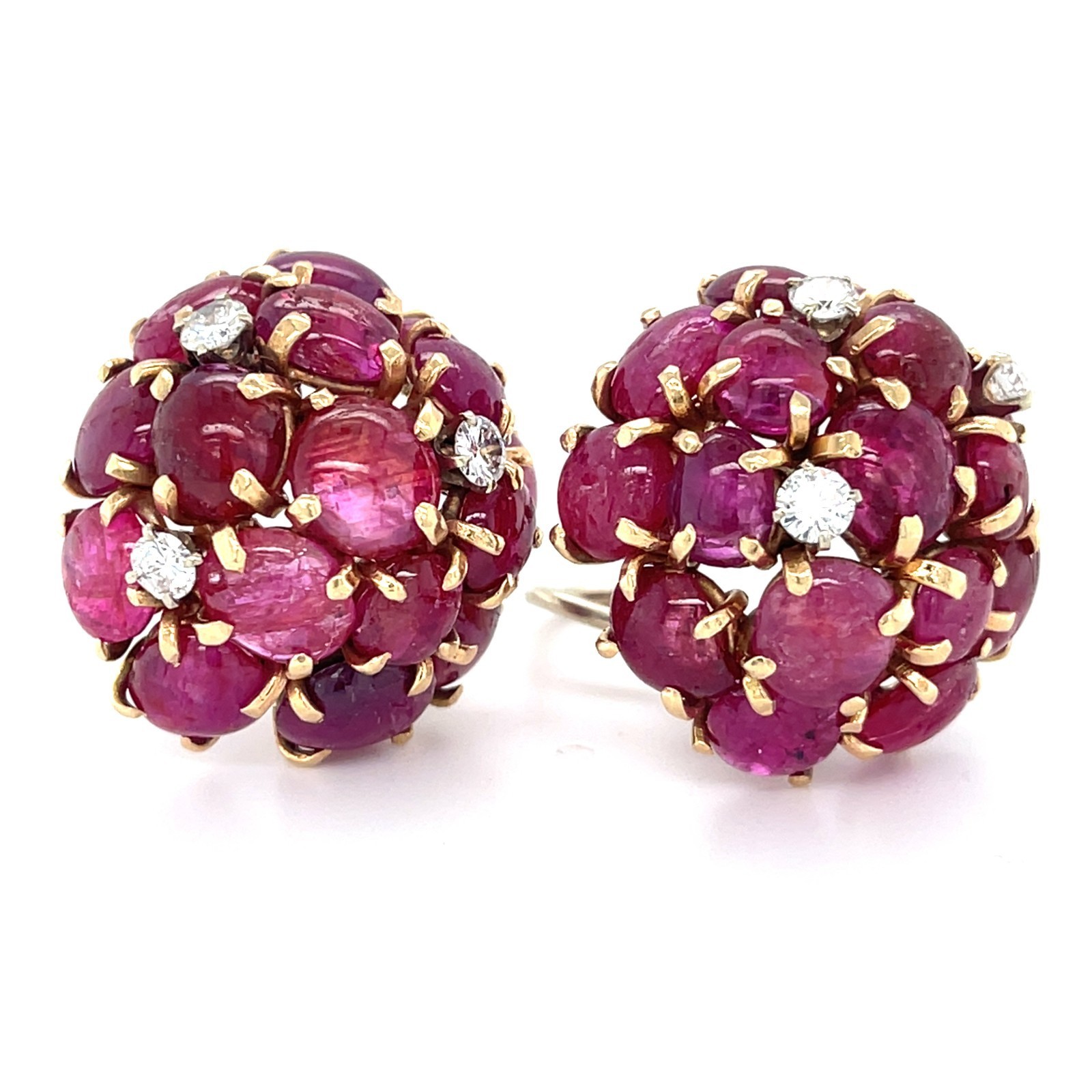 - 14k Yellow Gold 25.9 ct Ruby Cabochon Cluster Clip-On Earrings 0.80 ct Diamond