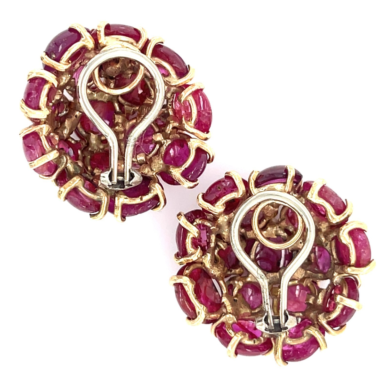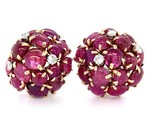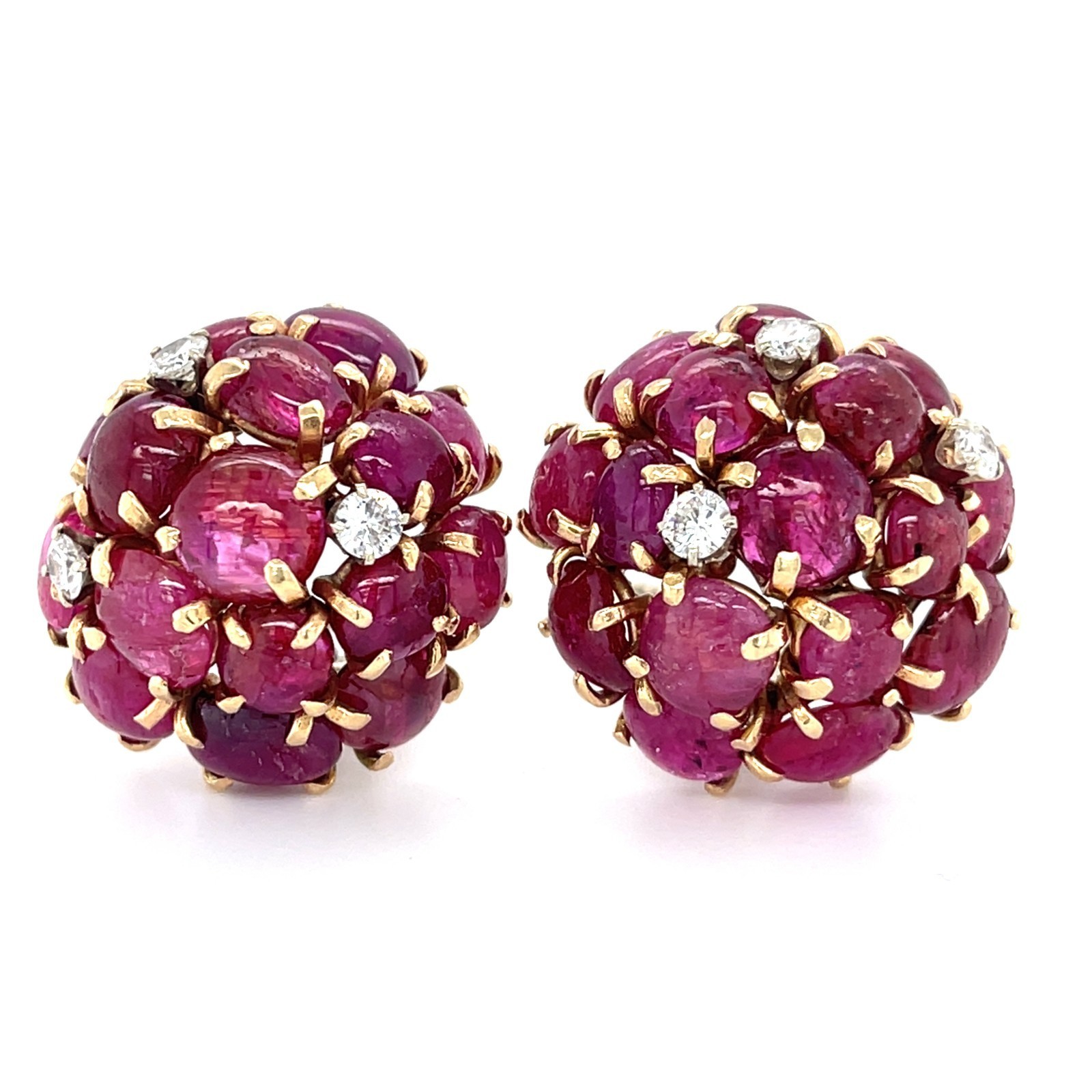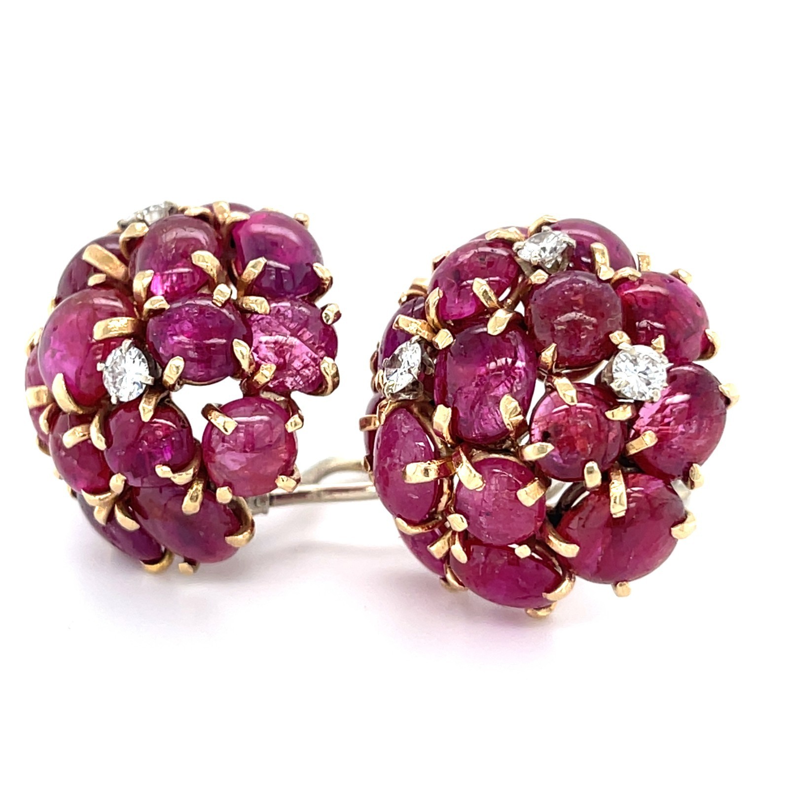 - 14k Yellow Gold 25.9 ct Ruby Cabochon Cluster Clip-On Earrings 0.80 ct Diamond