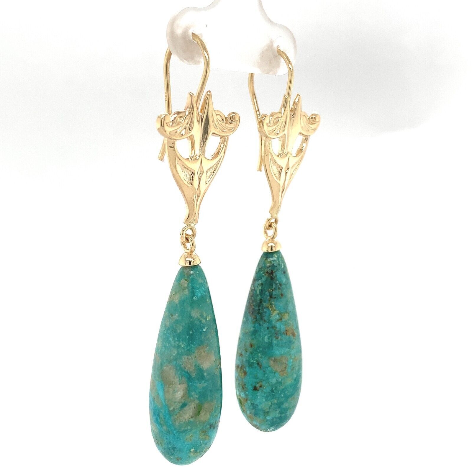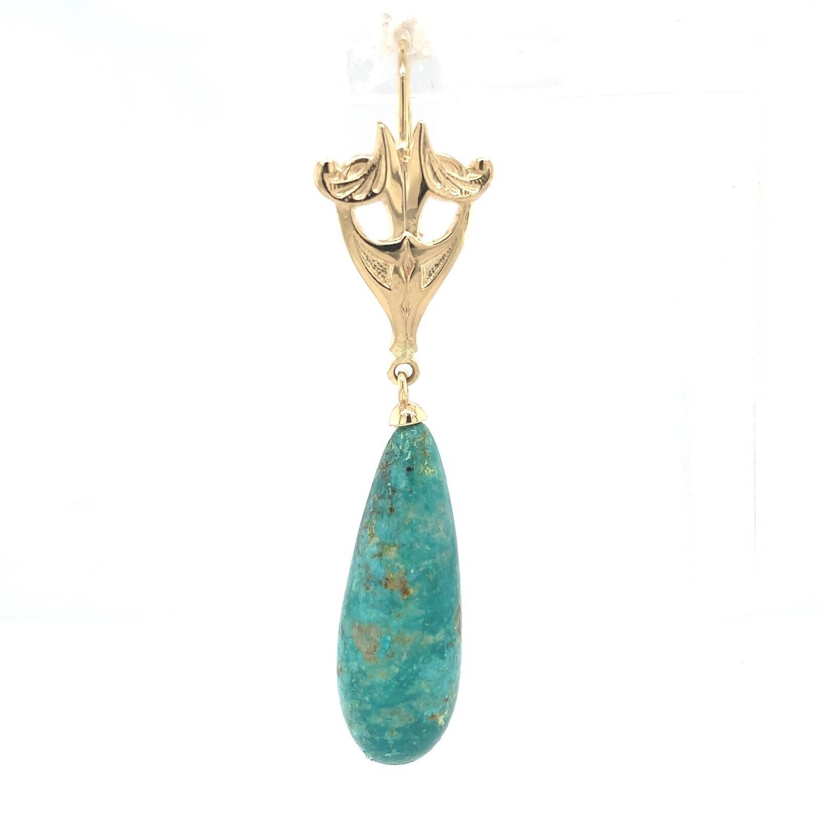 14k yellow gold earrings featuring a pair of large turquoise smooth briolettes weighing over 47 carats total weight. The turquoise hangs from Art Nouveau era casting newly made from the antique molds. The turquoise are a mottled light to dark green blue color with tan spots. The briolettes weigh 47.50 carat total, or about 23.75 carats each. The turquoise measure about 26mm x 10.8mm.
