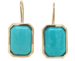 14k yellow gold pair of turquoise drop earrings with wire hooks. This is Kingman turquoise from Arizona, which is the last full-time production mine in the US. The smooth cabochon rectangular turquoise measures about 16mm x 12mm and weighs about 14 carats total. The turquoise is robin's egg blue with almost no veining. The turquoise is not as blue as appears in the photos.