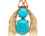 14k brooch/pin of a flying bug featuring genuine turquoise. The insect resembles a fly or bee. There are two turquoise cabochons. The oval measures about 10mm x 8mm, and the round measures about 6mm. There are two small round ruby accents measuring about 1.5mm.