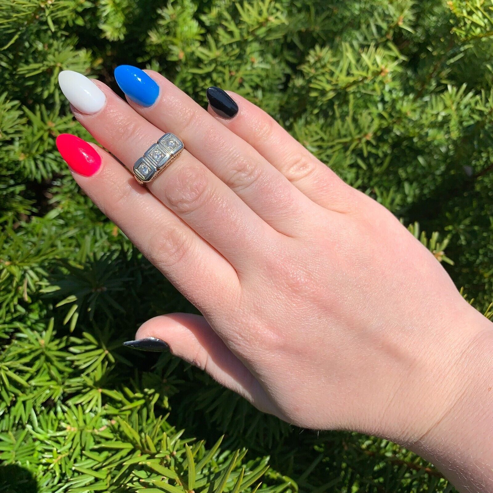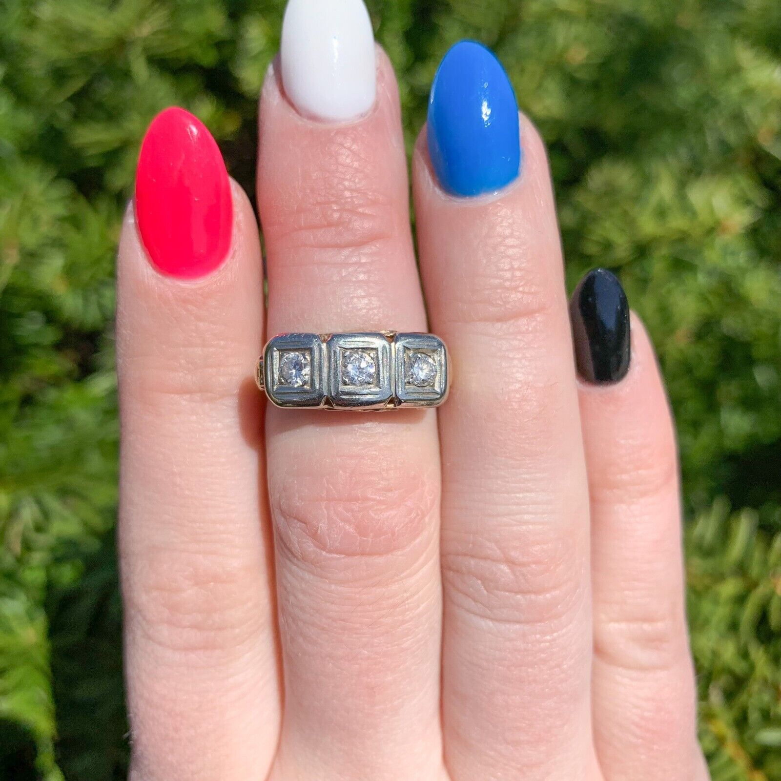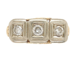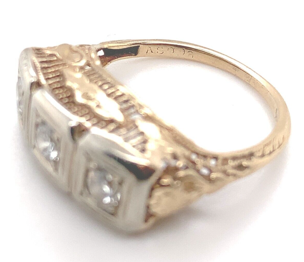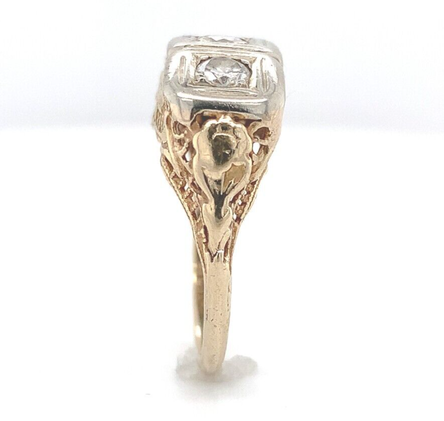 14k yellow gold filigree ring with three diamonds set in white gold. The diamonds are round brilliant cut and measure about 3.3mm. Total diamond weight is approximately .45ct. The ring fits a size 5 finger and weighs 1.97 dwt. It dates from the 1940s. The filigree has some wear and a few cracks. The underside is getting thin and is somewhat sharp. Wonderful ring!