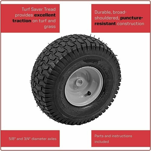 DIMENSIONS: 15" x 6" wheel with Turf Saver Tread 5/8" and 3/4" diameter axles