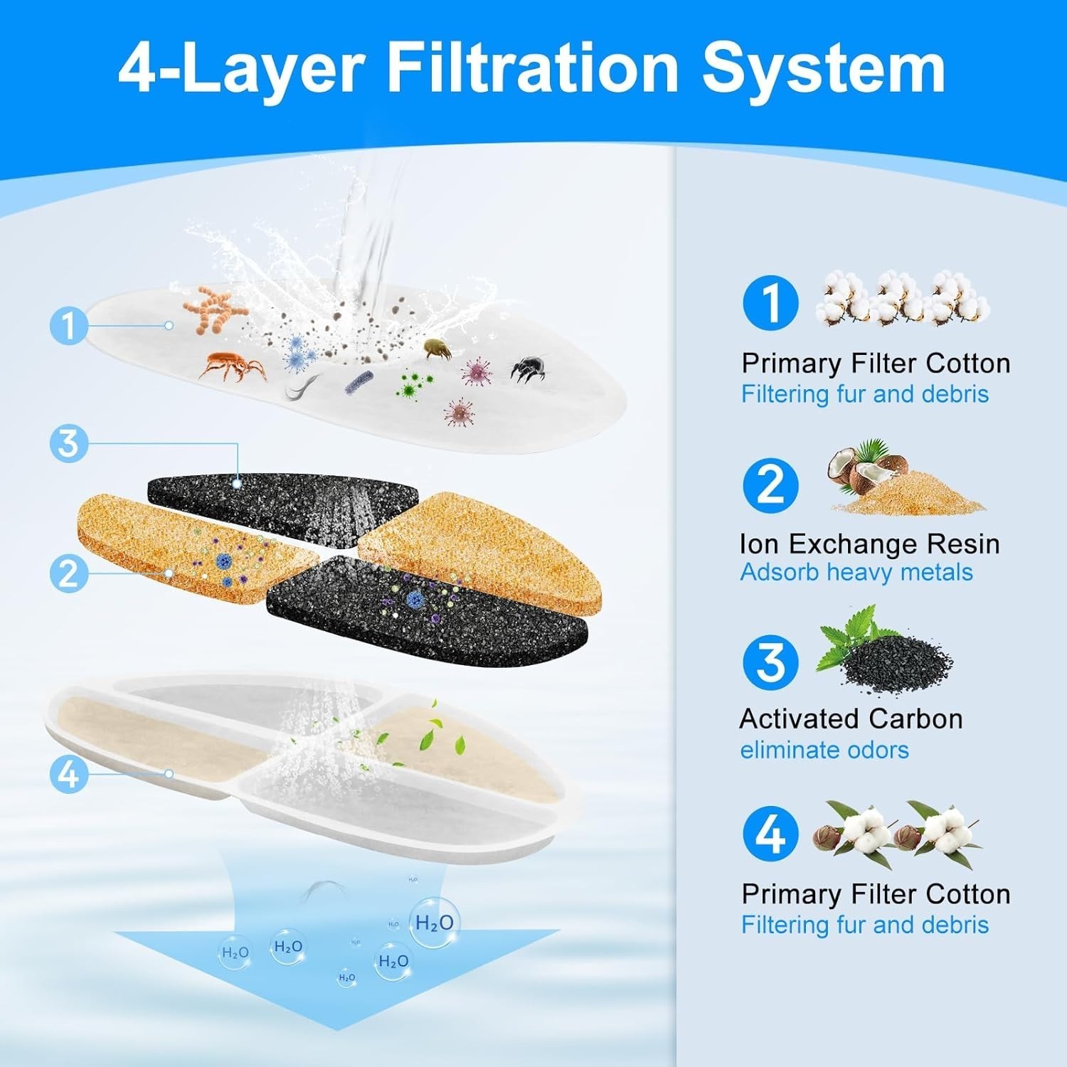 Activated carbon for odor removal?Silver ions and Ion exchange resin to remove heavy metals and soften water?Non-woven fabric for capturing pet hair and impurities?Integrated pump sponge for further debris filtration to prevent clogging
