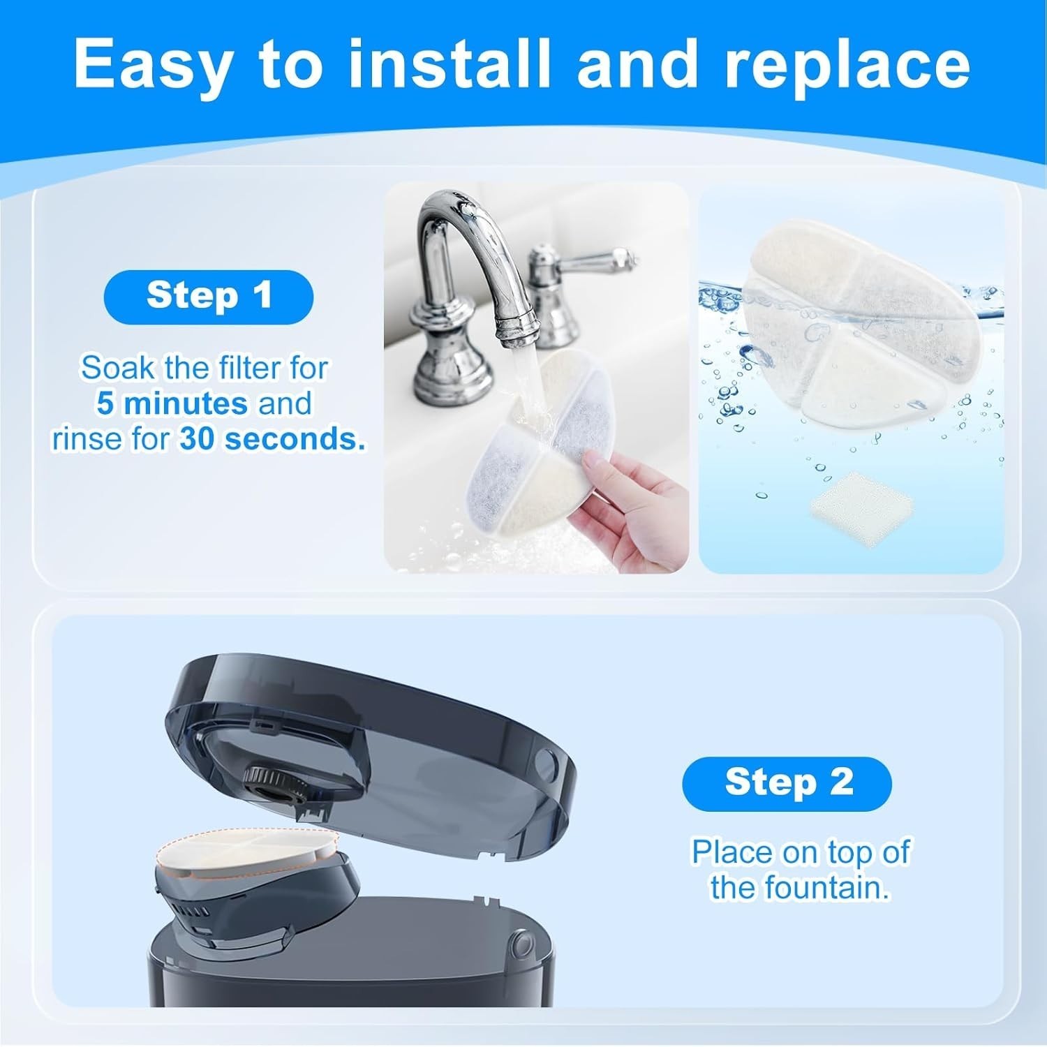 Soak the feel needy pet water fountain filter or 5 minutes and rinse for 30 seconds before use. We recommended replacing the filters every 2 weeks. If you have multiple pets, please clean the fountain and change the filter more often