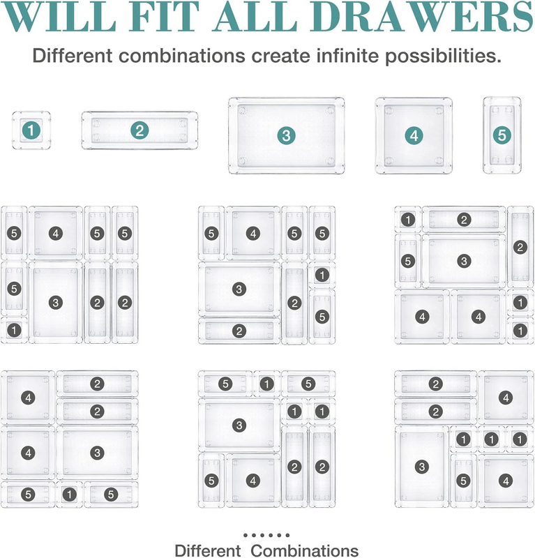 Versatile storage options: These plastic drawer organizers fit different size drawers and areas, such as vanity / bathroom / kitchen / office drawers. They are perfect for storing makeup, toothpaste, jewelry, stationery, craft supplies, and more