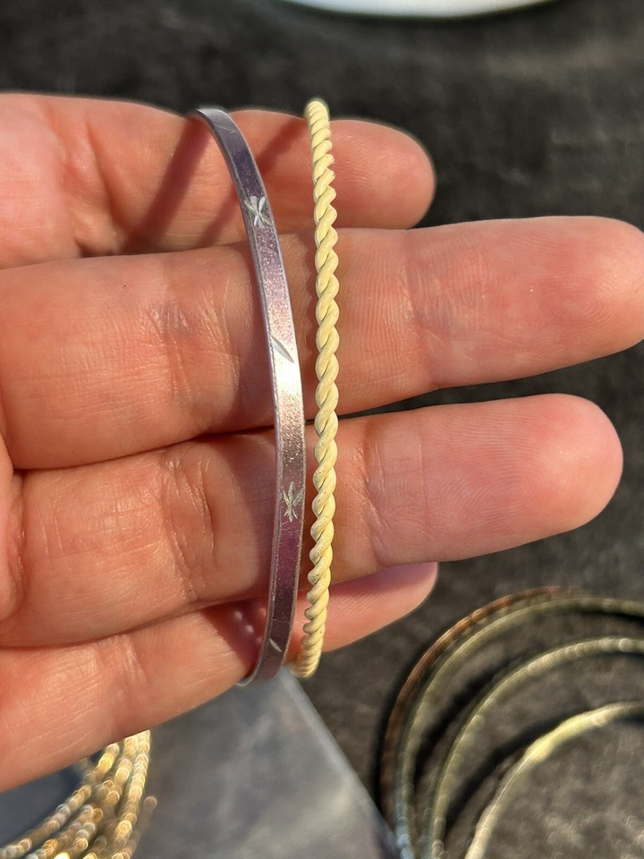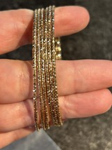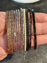 16- Gold, Silver, Black, White Light Pink Bangle Bracelets in various textures. Pre owned. May show some signs of wear.