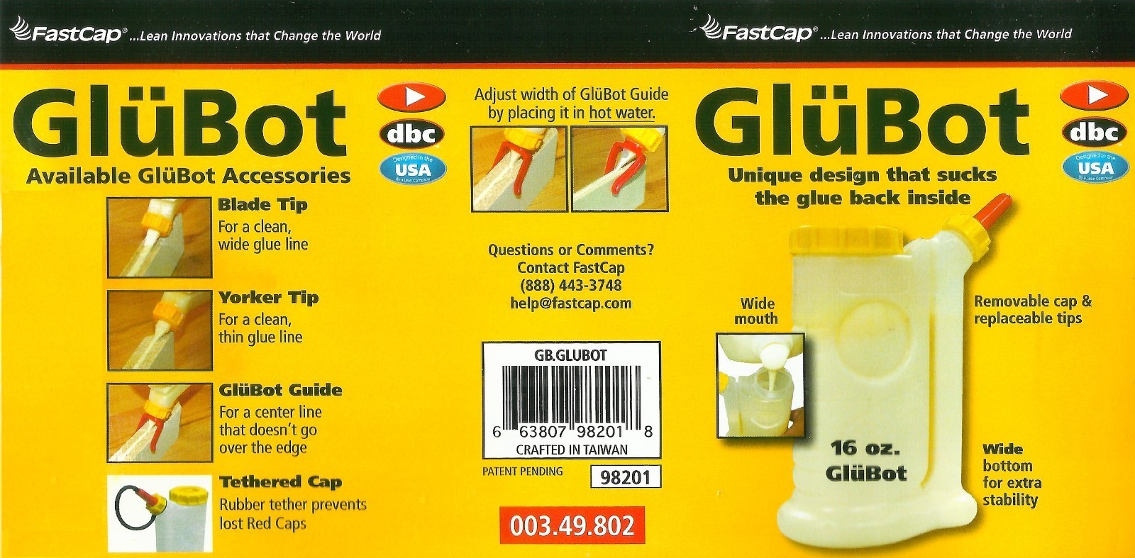 FOR SALE IS THIS ONE NEW (1) 16 fluid ounce GluBot BRAND STORAGE SQUEEZE PLASTIC BOTTLE GLUE DISPENSER WITH FOUR (4) PIECE ACCESSORY BAG INCLUDING BLADE TIP AND RING, RED RUBBER TETHERED CAP, GluBot GUIDE AND RING, AND YORKER TIP BY GluBot BRAND MADE BY FastCap WOODWORKING MPN 98201 UPC# 663807982018. THIS GENUINE GluBot IS THE FULL SIZE 16 ounce (473mL) CAPACITY FLAGSHIP PRODUCT OF FastCap WITH WIDE MOUTH, DURABLE AND TRANSLUCENT SOFT PLASTIC CONTAINER, REMOVABLE CAP AND REPLACEABLE TIPS AND WIDE BOTTOM FOR EXTRA STABILITY, PLUS FOUR (4) ACCESSORIES ARE INCLUDED IN THE ACCESSORIES BAG. THE GluBot FROM FastCap IS THE ONLY GLUE BOTTLE THAT WILL NOT DRIP OR SPILL. YOU NEVER HAVE TO CLEAN UP GLUE SPILLS OR DRIPS AGAIN. THE EASY SQUEEZE GluBot WILL PUT THE GLUE WHERE YOU WANT IT, ONLY WHERE YOU WANT IT. GlueBot FEATURES A TWO (2) CHAMBER SYSTEM THAT PUSHES GLUE FROM THE BOTTOM UP THROUGH THE SECONDARY SIDE CHAMBER WHICH ENSURES FRESH GLUE EVERY TIME, VERTICAL APPLICATIONS ARE NEAT, DRIPLESS AND EASY. GluBot WORKS FOR YELLOW GLUE, WOOD GLUE AND MANY OTHER LIQUIDS, INCLUDING SOLVENTS. THIS 16 ounce CAPACITY GluBot ALLOWS FOR FAST AND EASY STORAGE, SOFT AND PLABLE TRANSLUCENT SQUEEZE BOTTLE DELIVERS NO-DRIP APPLICATIONS AND A CONTROLLED SQUEEZE FOR BETTER AND SMOOTHER APPLICATION. STOP WRESTLING WITH THE OLD GLUE BOTTLES THAT CLOG UP FOLLOWING EVERY USE. A FOUR PIECE ACCESSORY BAG IS INCLUDED THAT MAXIMIZE THE PERFORMANCE OF YOUR GluBot. GENUINE GluBot IS GREAT FOR CARPENTERS, WOODWORKERS, CRAFTING, ETC. WITH GlueBot YOU CAN POUR ALL THOSE OLD GLUE BOTTLES INTO THE WIDE MOUTH OPENING AT THE TOP AND TOSS AWAY THE OLD BOTTLES. THE UNIQUE GluBot DESIGN SUCKS THE GLUE BACK INSIDE AFTER EACH USE, USE THE BLADE TIP FOR A CLEAN, WIDE GLUE LINE, USE THE YORKER TIP FOR A CLEAN THIN GLUE LINE, USE THE GluBot GUIDE FOR A CENTER LINE THAT DOESN'T GO OVER THE EDGE. THE RED RUBBER TETHERED CAP PREVENTS LOSS AND MAINTAINS THE INTEGRITY OF THE GLUE INSIDE. YOU WILL RECEIVE ONE (1) FULL SIZE 16 ounce GluBot WITH THE FOUR ACCESSORY BAG BY FastCap, SHIPPED BY USPS FIRST CLASS MAIL.....