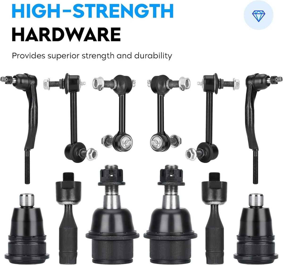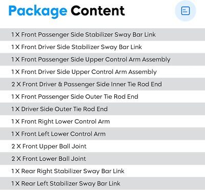 Kit Includes: 2x Front Stabilizer Sway Bar Link, 2x Front Upper Control Arm Assembly, 2x Front Driver Passenger Side Inner Tie Rod End, 2x Front Outer Tie Rod End, 2x Front Lower Control Arm, 2x Front Upper Ball Joint, 2x Front Lower Ball Joint, 2x Rear Stabilizer Sway Bar Link Compatible with: for 2004-2007 Buick Rainier; for 2004-2007 Chevrolet Trailblazer (EXT); for 2004-2008 GMC Envoy XL XUV; for 2004-2008 Isuzu Ascender; for 2005-2009 Saab 9-7X Installation Notes: The suspension kit must be installed by professionals. All the control arms assembly come pre-greased. Replace for Part Number: 15918823 15918822 25786775 25786774 26100288 26100287 26100286 22157320 22157319 88982343 88982342 Quality Assurance: 12-month warranty! tested before shipping.