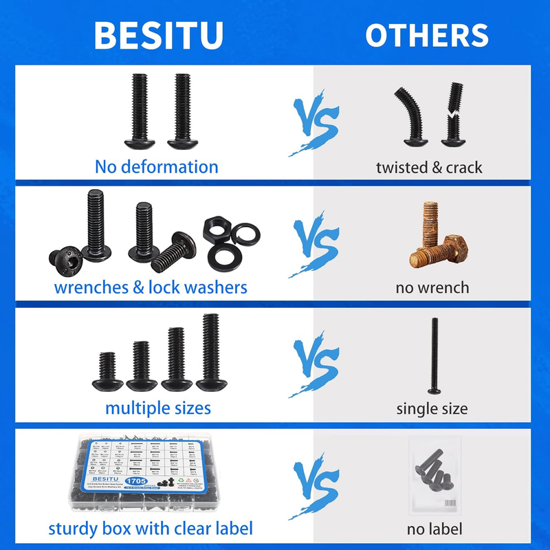 ? ALLOY STEEL MACHINE SCREWS?1705Pcs well-engineered machine screw assortment with sixteen different sizes and lengths of bolts. They are alloy steel, good black coating, no burrs, perfect fit among screws, nuts, lock flat washers.