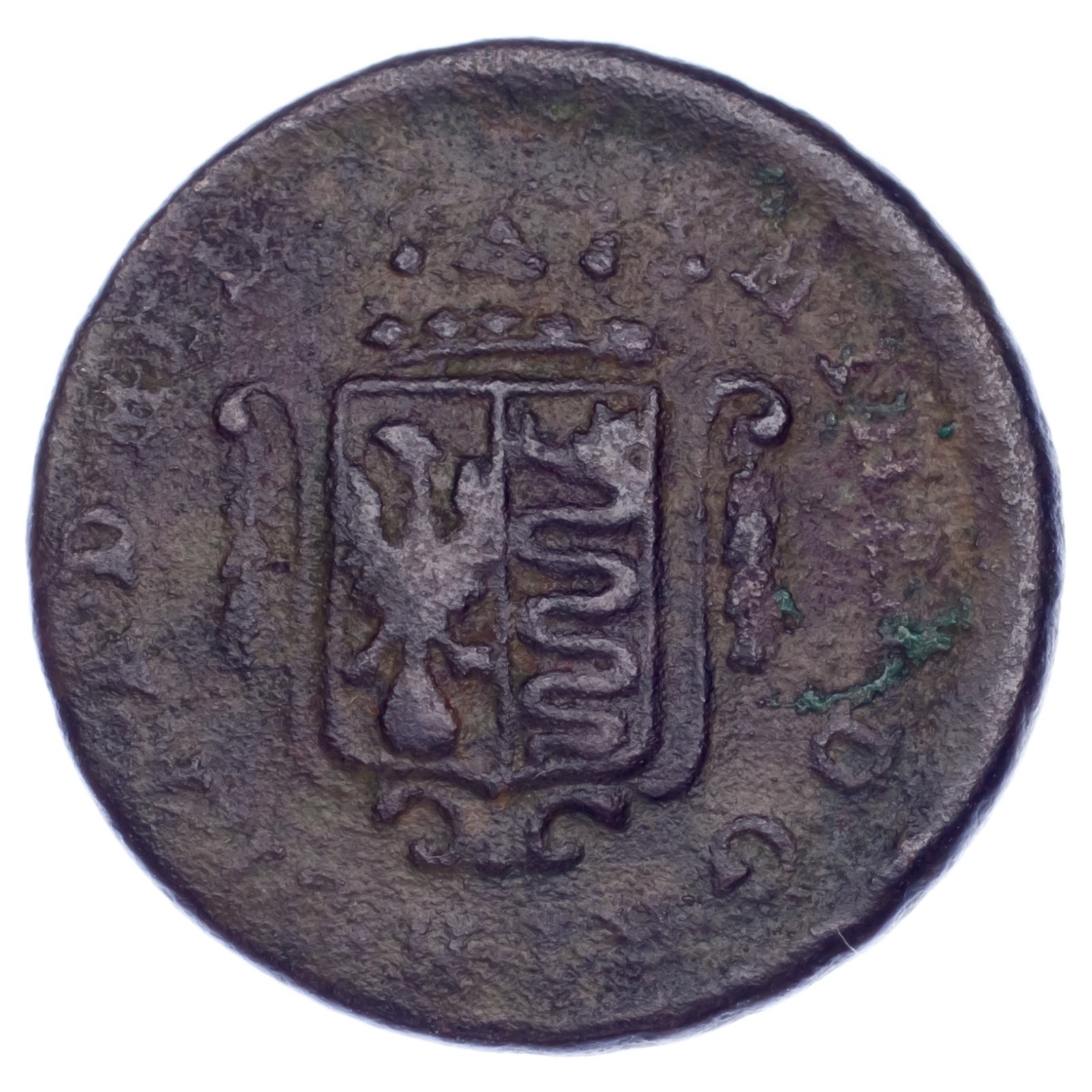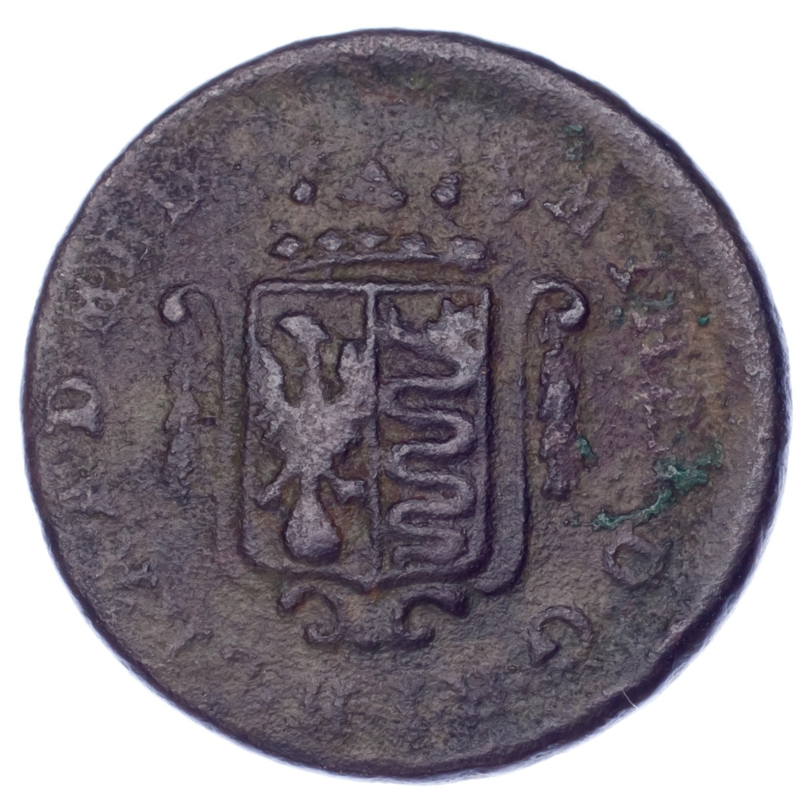 Obverse: Crowned shield of 2-fold arms in frame ornamented with garlands