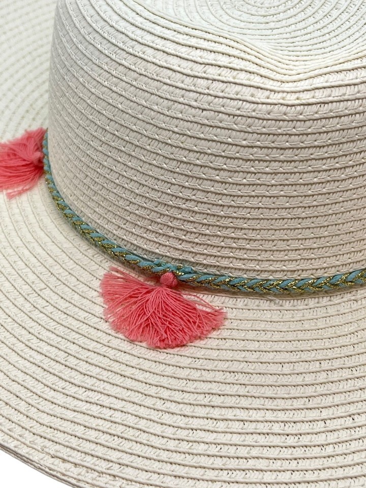 Lightweight and stylish, this sun hat shields from the sun while adding a charming touch with pink tassels and an accented braided band.